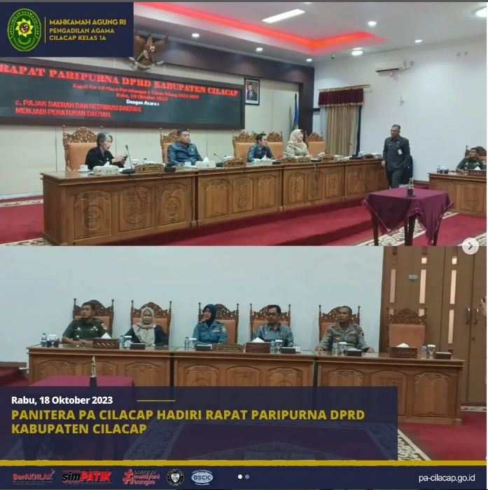Cilacap, Rabu (18/10/2023) – PA Cilacap yang di wakili oleh Panitera Bp. Sultan Hakim, S.Ag., SH, hadiri Rapat Paripurna DPRD Kabupaten Cilacap dengan acara “Pajak daerah dan retribus daerah menjadi peraturan daerah” bertempat di Ruang Rapat Paripurna DPRD Lantai II
