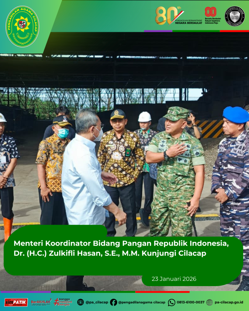 Cilacap, 23 Januari 2026 – Wakil Ketua Pengadilan Agama Cilacap, Azimar Rusydi, S.Ag., M.H., turut menghadiri acara kunjungan kerja Menteri Koordinator Bidang Pangan Republik Indonesia, Dr. (H.C.) Zulkifli Hasan, S.E., M.M., yang berlangsung di TPST RDF Plant Jeruklegi, Cilacap pada hari Jumat (23/1). Acara ini menjadi momentum penting dalam upaya pemerintah memperkuat ketahanan pangan […]