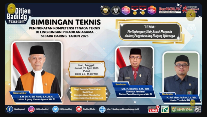 Bimbingan Teknis kali ini mengangkat tema “Perlindungan Hak Asasi Manusia dalam Penyelesaian Hukum Keluarga”, dengan narasumber Yang Mulia Hakim Agung Kamar Agama Mahkamah Agung Republik Indonesia, Bapak Dr. H. Edi Riadi, S.H., M.H. dan diikuti oleh peserta secara daring dari lingkungan Peradilan Agama seluruh Indonesia.