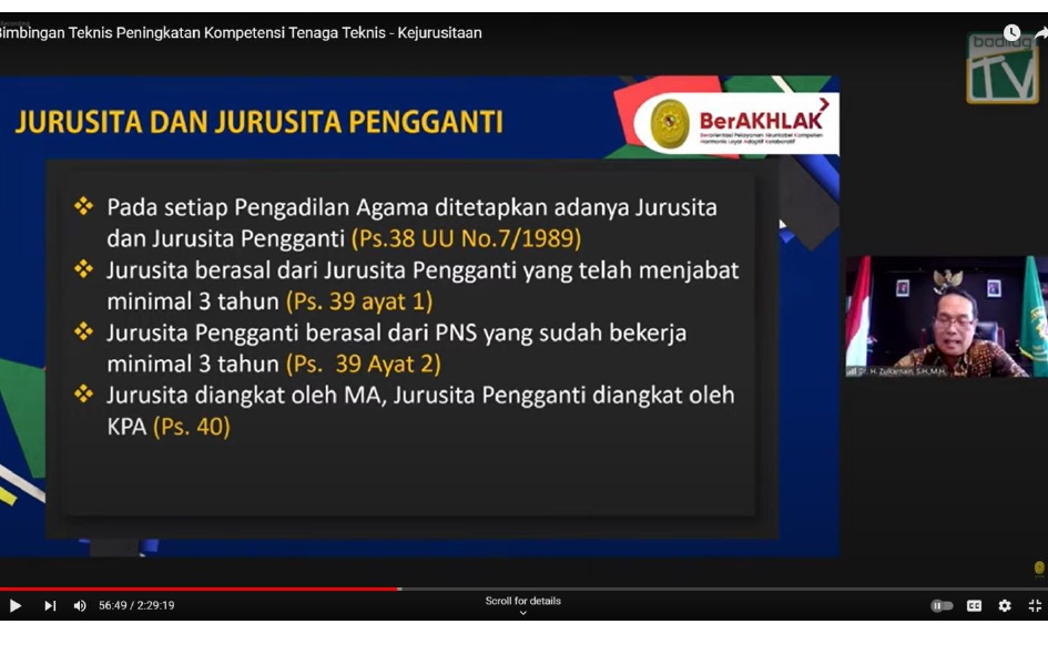 Cilacap, PA Cilacap – Jumat 16 Desember 2022, Aparatur Pengadilan Agama Cilacap kembali mengikuti Bimtek Peningkatan kompetensi Tenaga Teknis yang diadakan oleh Ditjen Badan Peradilan Agama (Badilag) Mahkamah Agung RI secara Daring. Pada Bimtek kali ini Penyelenggara mengusung Tema tentang Kejurusitaan (Permasalahan dan Solusi) yang sudah barang tentu peserta yang dituju pada kegiatan ini adalah para Juru Sita dan Juru Sita Pengganti di seluruh Pengadilan Agama se-Indonesia baik tingkat pertama maupun Pengadilan Tingkat Banding.