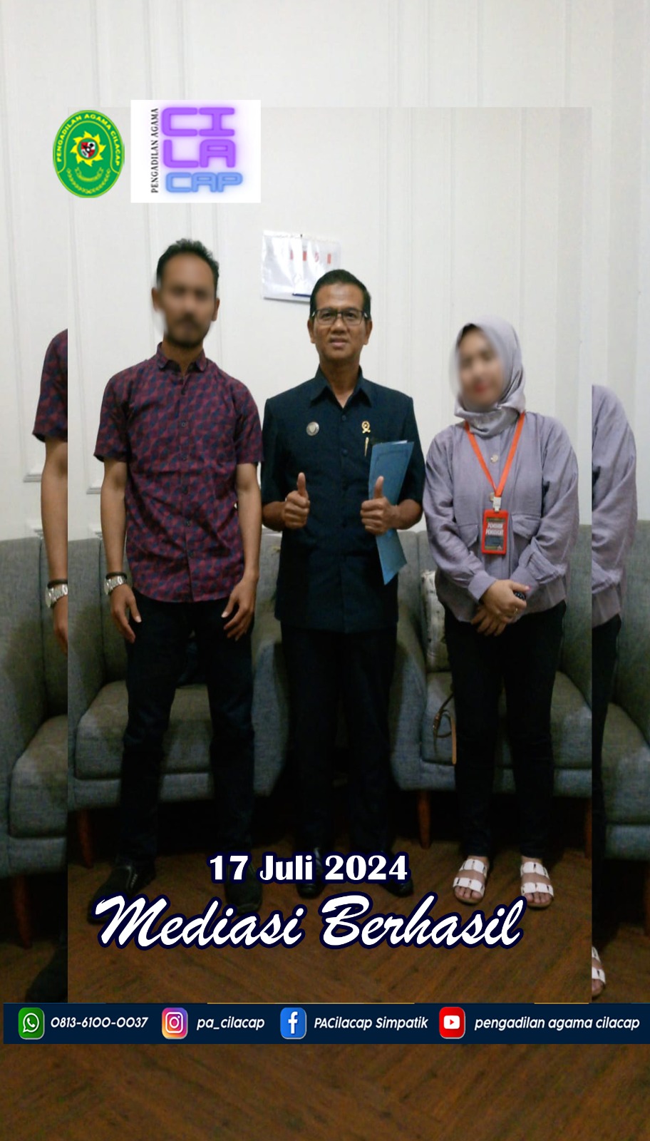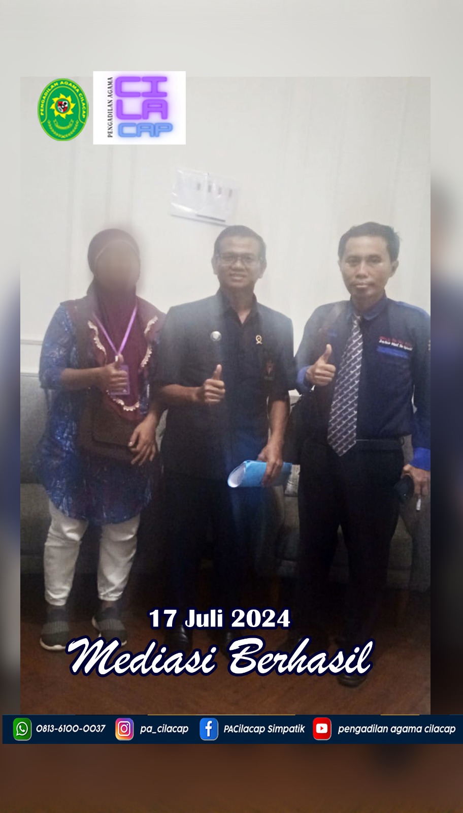 Cilacap, 17 Juli 2024, Hakim mediator Pengadilan Agama Cilacap Bapak Drs. Munjid Lughowi, MH. yang berhasil mendamaikan para pihak dalam perkara Cerai Gugat dan Cerai Talak dan terdaftar dengan nomor: 2919/Pdt.G/2024/PA.Clp, 2902/Pdt.G/2024/PA.Clp, 3025/Pdt.G/2024/PA.Clp dan 3106/Pdt.G/2024/PA.Clp yang dilakukan di ruang mediasi Pengadilan Agama Cilacap.