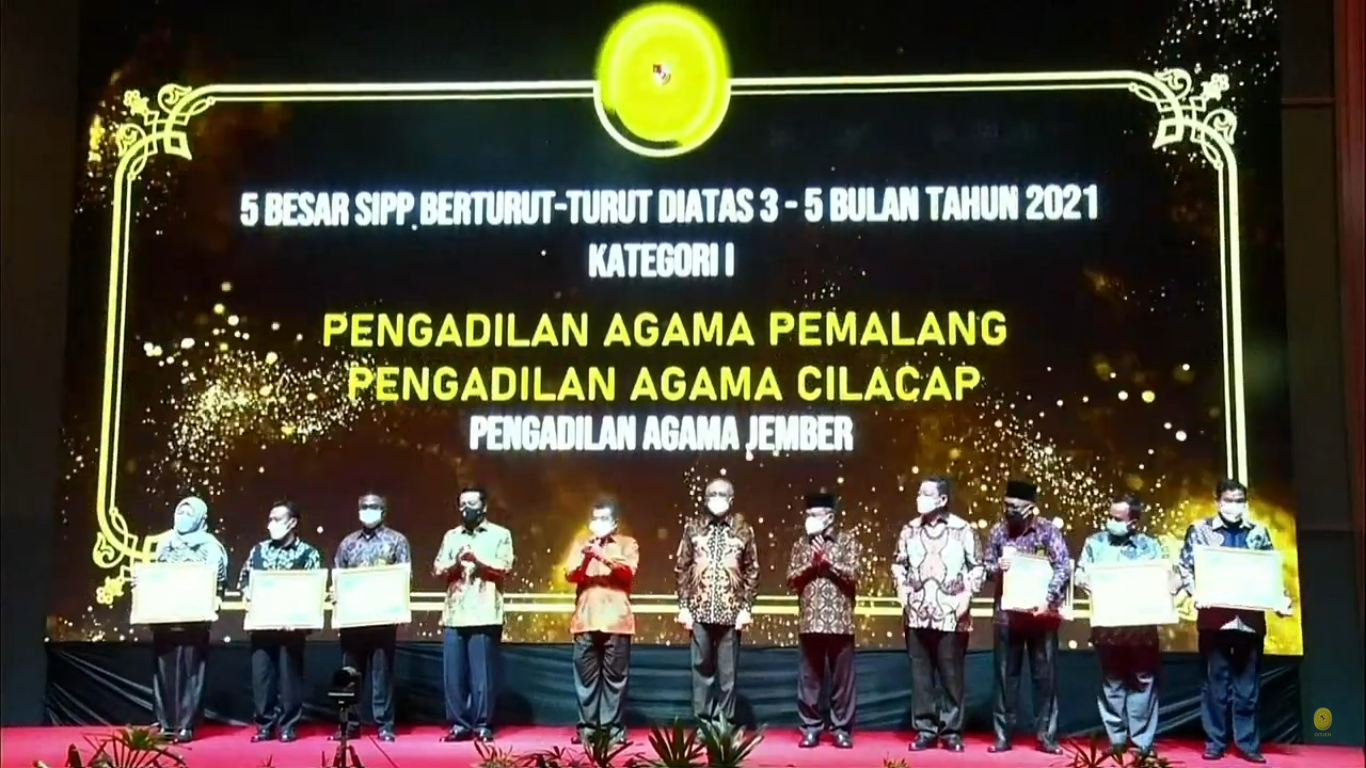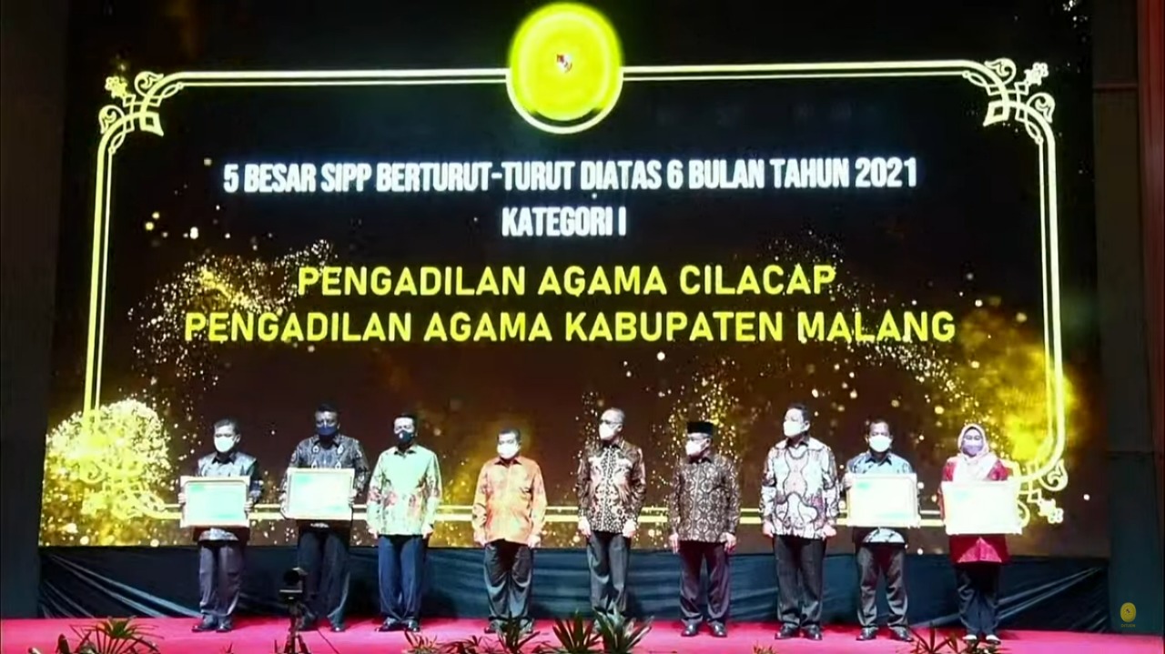 Minggu, 13 Maret 2022, dalam acara Launching Aplikasi, Penyerahan Penghargaan dan Rapat Kordinasi Dirjen Badilag yang bertempat di Hotel Harris Surabaya, Ditjen Badilag mengumumkan beberapa satker yang mendapatkan penghargaan berdasarkan beberapa kategori yang telah ditentukan oleh Badilag. Syukur Alhamdulillah, Pengadilan Agama Cilacap mendapatkan dua penghargaan sebagai satker Lima Besar SIPP Berturut – Turut Diatas Tiga sampai Lima Bulan Tahun 2021 Kategori I, dan Sebagai Peringkat 1 peraih 5 Besar SIPP Kategori I Selama Enam Bulan Berturut – Turut atau Lebih Pada Tahun 2021. Penghargaan tersebut di Serahkan Langsung oleh Ketua Mahkamah Agung RI Prof. Dr. Muhammad Syarifuddin,SH.,MH kepada Ketua Pengadilan Agama Cilacap Drs. M. Ihsan, M.H. Acara tersebut selain dihadiri oleh Ketua Pengadilan Agama Cilacap secara langsung juga diikuti secara daring oleh seluruh aparatur Pengadilan Agama Cilacap yang setia mengikuti acara dari awal sampai akhir.