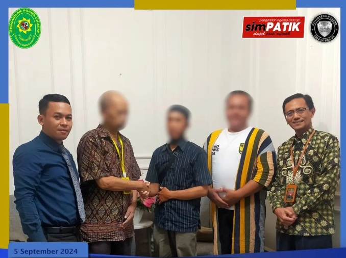Cilacap, 5 September 2024 – Mediator Hakim Pengadilan Agama Cilacap, Drs. Noor Shofa, S.H., M.H. berhasil memediasi perkara waris dengan No. 3498/Pdt.G/2024/PA.Clp, setelah melewati beberapa tahap mediasi, akhirnya berhasil, mereka sepakat membuat surat kesepakatan perdamaian.