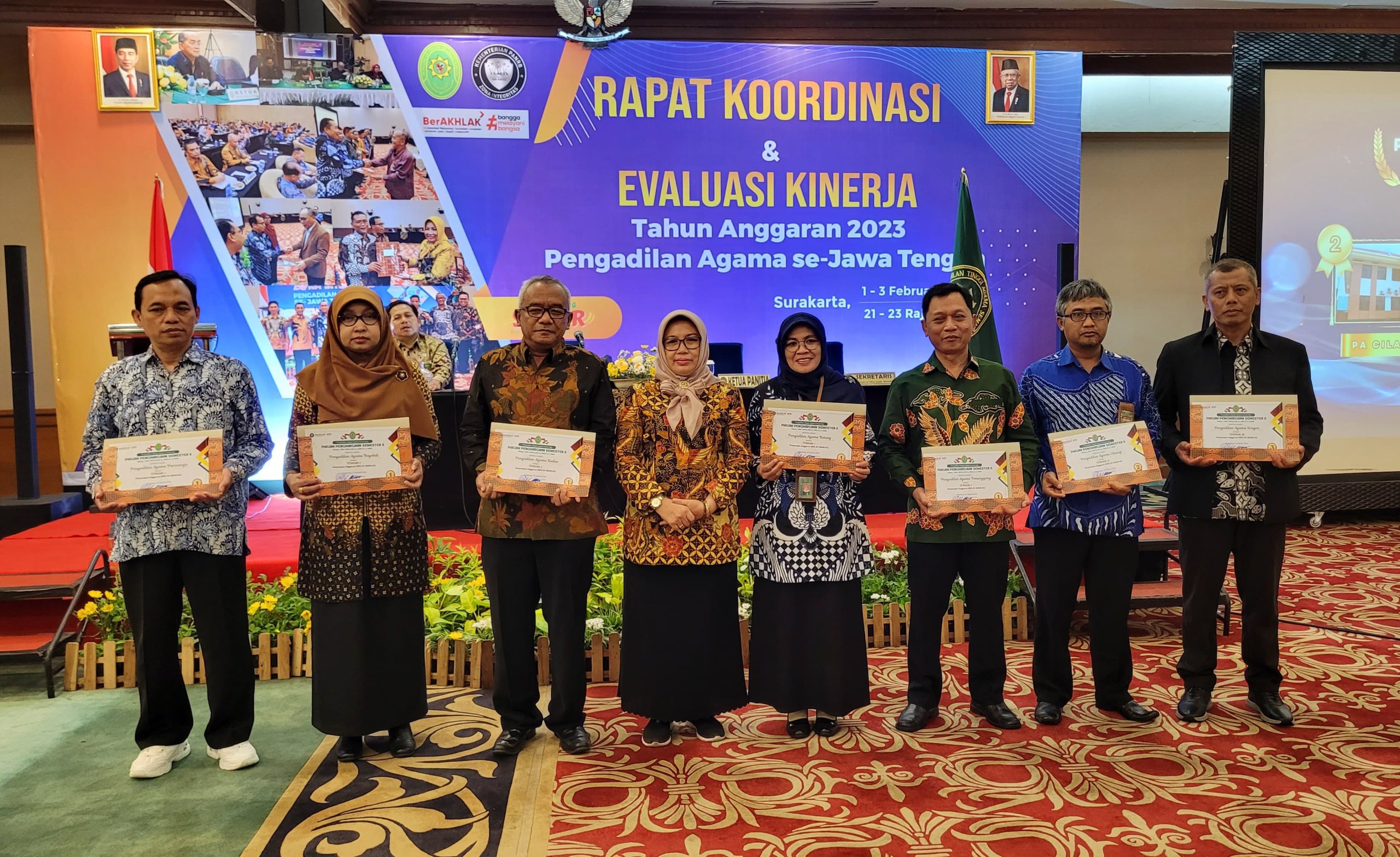 Bertempat di Ballroom Sumaryo The Sunan Hotel Jalan Ahmad Yani Surakarta Ketua PTA Semarang, memberikan penghargaan atas kinerja Pengadilan Agama se Jawa Tengah pada Semester II Tahun 2023. Pemberian penghargaan ini dilangsungkan dalam kegiatan Rapat Koordinasi dan Evaluasi Kinerja Peradilan Agama Jawa Tengah Tahun 2023 yang dilaksanakan di Surakarta pada 1 hingga 3 Februari 2024 di Surakarta.