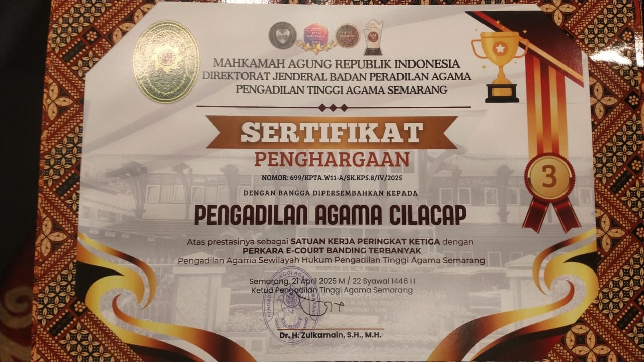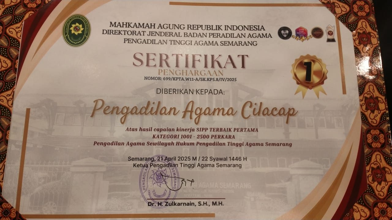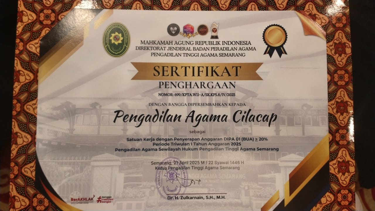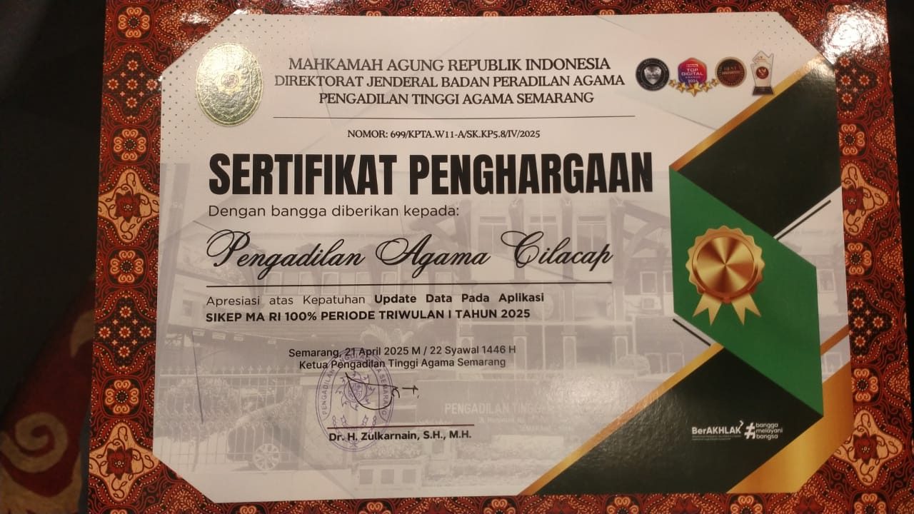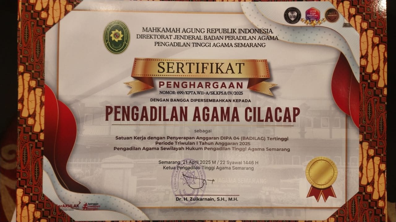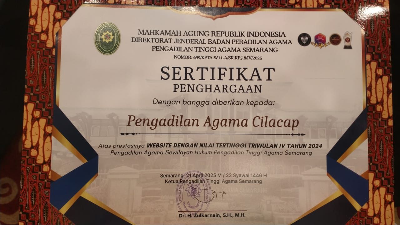 Cilacap, 22/04/2025 – Pengadilan Agama (PA) Cilacap kembali menorehkan prestasi gemilang pada ajang PTA Semarang Awards Triwulan I Tahun 2025 yang bertempat di The Sunan Hotel Solo pada 21 April 2025