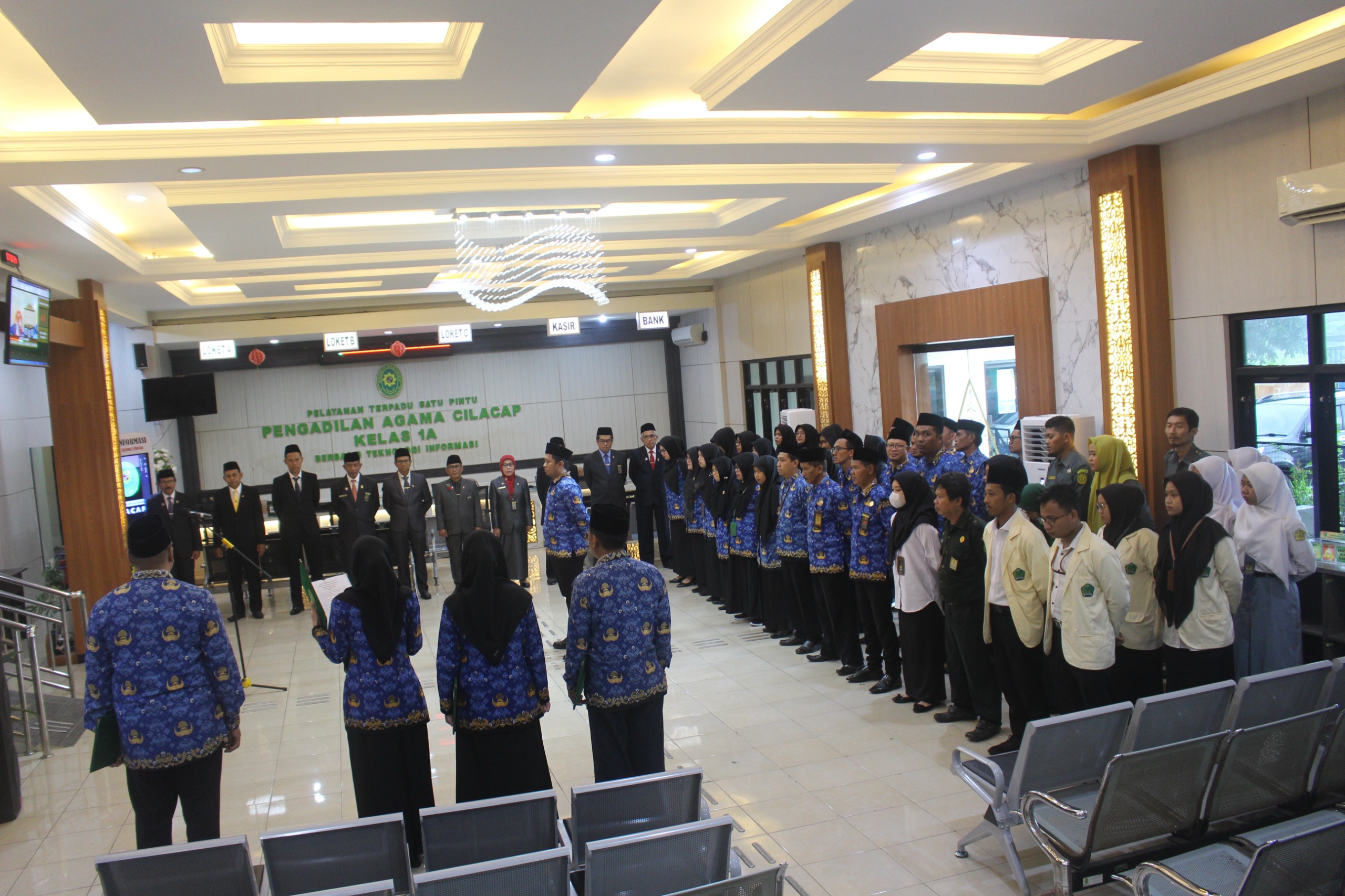 Cilacap – Pengadilan Agama Cilacap melaksanakan Upacara Peringatan Hari Sumpah Pemuda ke-97 Tahun 2025. Upacara yang berlangsung khidmat di Ruangan PTSP pada Selasa (28/10) ini, diikuti oleh Hakim, Pejabat Struktural dan Fungsional, staff, P3k, PPNPN, mahasiswa PPL dan siswa PKL. Upacara ini digelar serentak di seluruh Indonesia sebagai wujud penghargaan dan pengamalan semangat persatuan yang diikrarkan oleh para pemuda pada 28 Oktober 1928.
