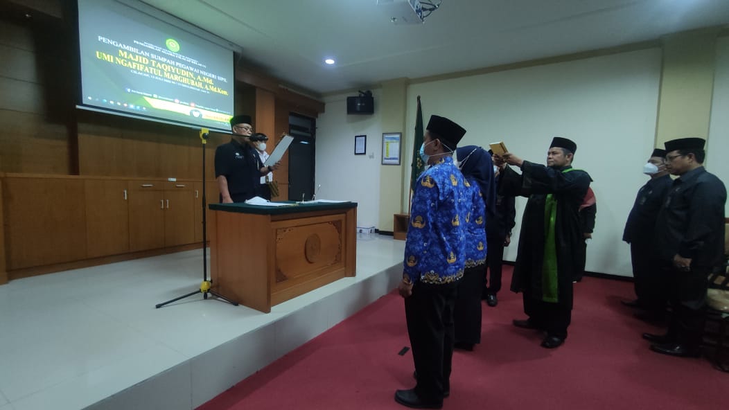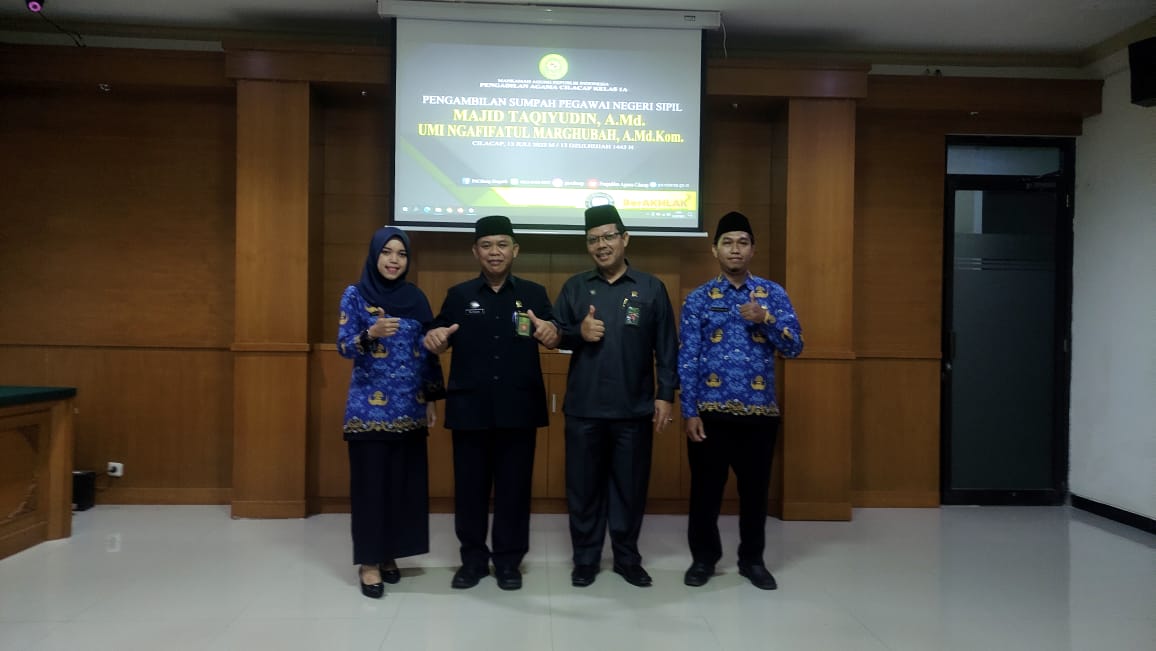 Keduanya didampingi 2 orang saksi dan 1 orang rohaniwan, dilantik dan diambil sumpahnya oleh Ketua Pengadilan Agama Cilacap, Drs. M. Ihsan, M.H., di Ruang Sidang Utama Pengadilan Agama Cilacap pukul 14.00 WIB.