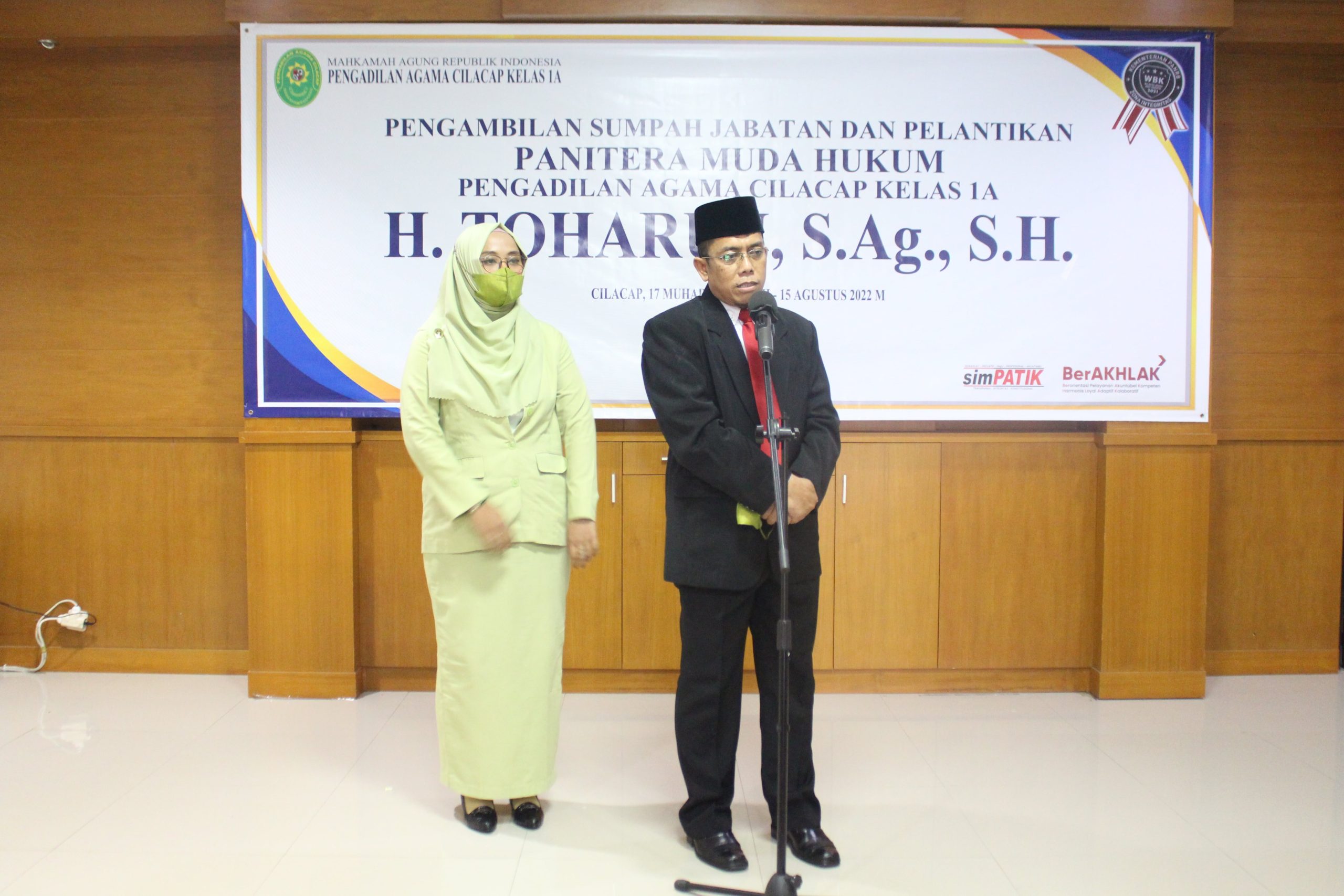 Cilacap, 15 Agustus 2022 pukul 14.00 WIB bertempat di Ruang Sidang Utama Pengadilan Agama Cilacap, dilaksanakan acara Pelantikan dan Pengambilan Sumpah Jabatan Atas Nama H. Toharun, S.Ag., S.H., sebagai Panitera Muda Hukum. Bertindak sebagai Pejabat Yang Mengambil Sumpah Drs. M. Ihsan, M.H., selaku Ketua Pengadilan Agama Cilacap.