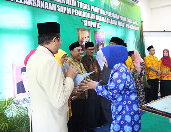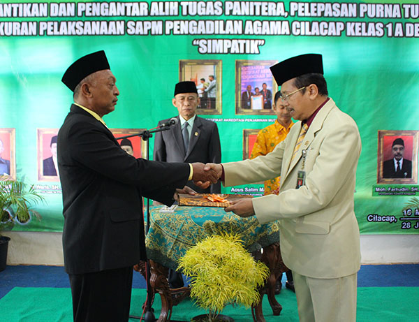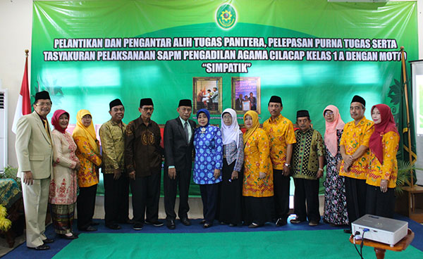 Jum’at (16/3/18)Pengadilan Agama Cilacap mengadakan pisah sambut, perpisahan dan tasyakuran pelaksanaan SAPM. Acara yang dihadiri Ketua Pengadilan Agama se kordinator ex karesidenan Banyumas beserta Panitera dan Sekretaris, Ketua PA Pekalongan, advokat dan keluarga besar Pengadilan Agama Cilacap diawali dengan pelantikan dan pengambilan sumpah Panitera Pengadilan Agama Cilacap Drs. H. Jamali menggantikan H. Waris, SH, S.Ag, MSi. yang sebelumnya telah dilantik menjadi Panitera Pengganti di Pengadilan Tinggi Agama Yogyakarta (12/3/18).