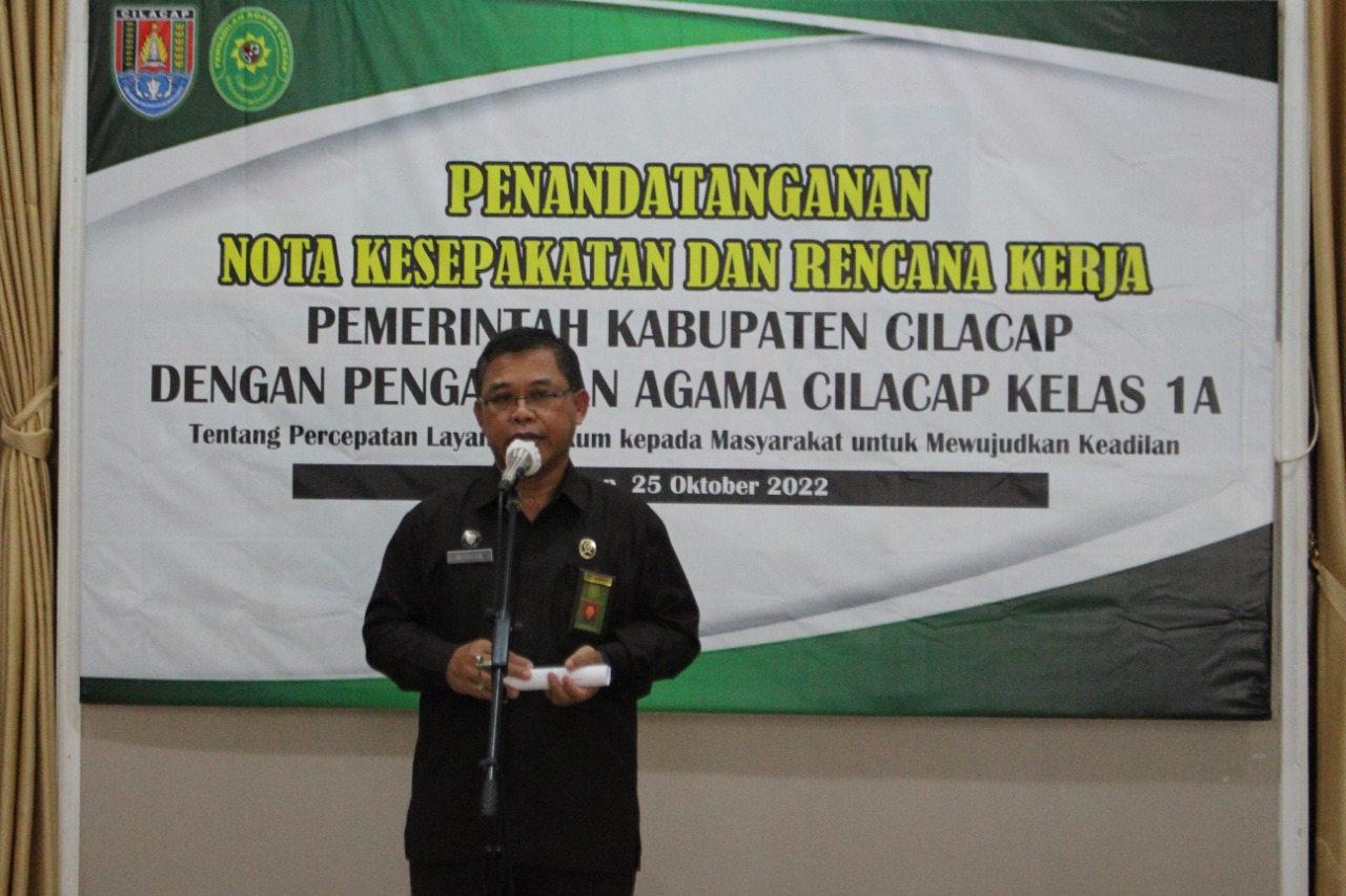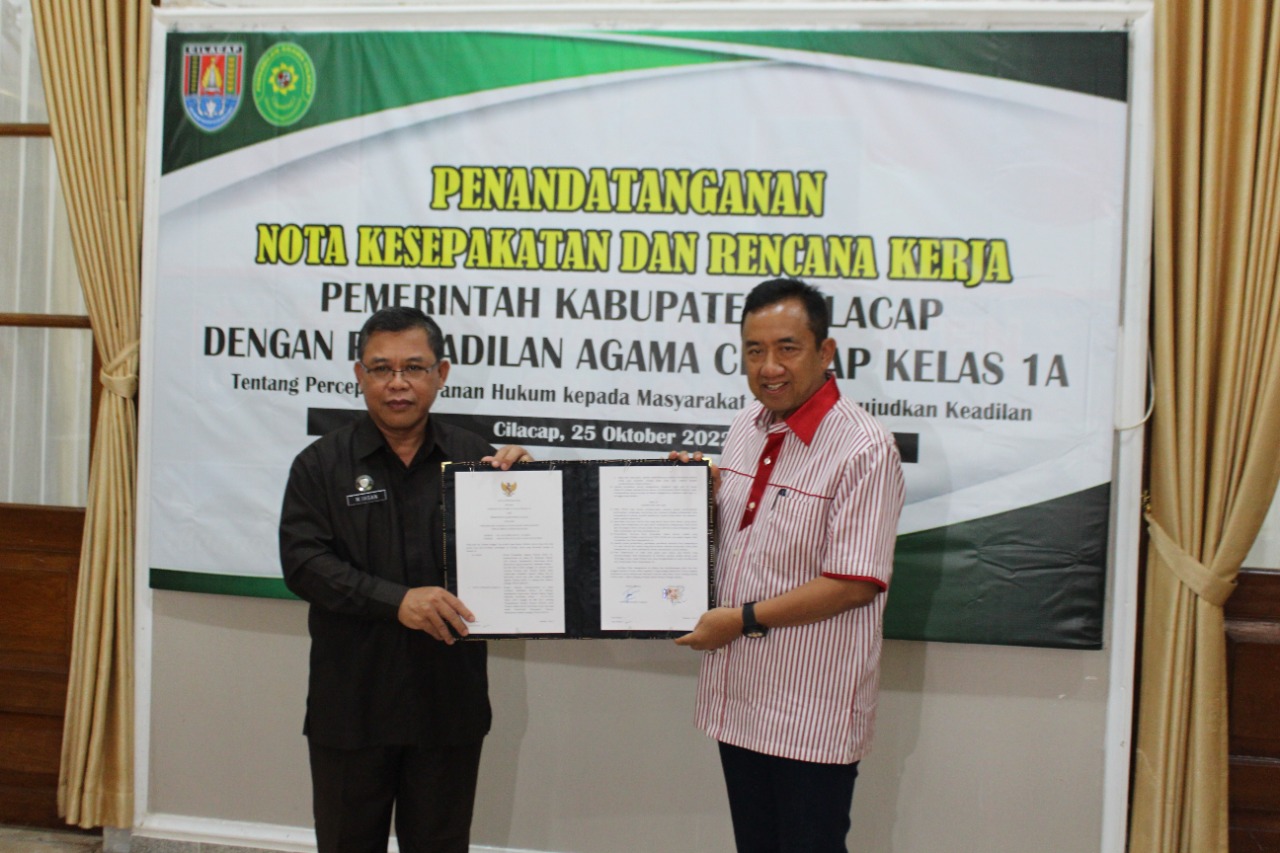 Selasa, 25 Oktober 2022 bertempat di Ruang Gadri Komplek Rumah Dinas Bupati, Ketua Pengadilan Agama Cilacap Kelas 1A Bapak Drs. M. Ihsan, M.H. dan Bupati Cilacap Bapak Tatto Suwarto Pamuji Penandatanganan Nota Kesepakatan dan Rencana Kerja. Pengadilan Agama Cilacap Kelas 1A berupaya untuk menjalin sinergi dalam rangka Percepatan Layanan Hukum kepada Masyarakat untuk Mewujudkan Keadilan.