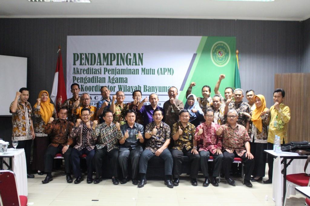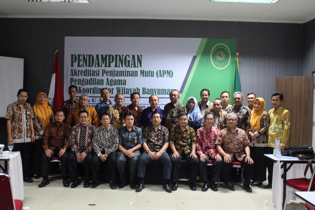 Pengadilan Agama se-koordinator Wilayah Banyumas mendapatkan kesempatan Pendampingan Akreditasi Penjaminan Mutu (APM) untuk meningkatkan kesiapan dan pematangan, serta sebagai wujud keseriusan Pengadilan Agama Tingkat Pertama di wilayah Pengadilan Tinggi Agama Semarang khususnya se-koordinator wilayah Banyumas dalam meraih APM (Akreditasi Penjaminan Mutu). Acara Pendampingan APM (Akreditasi Penjaminan Mutu) diisi oleh narasumber assessor eksternal dari Badilag Zulfikar Arif Rahman Purba, S.H., M.M. (Sekretaris Pengadilan Agama Wonosobo), Sutris, S.H., M.H. (Sekretaris Pengadilan Agama Pekalongan) dan Tukiran, S.H., M.M. (Panitera Pengadilan Tinggi Agama Semarang).