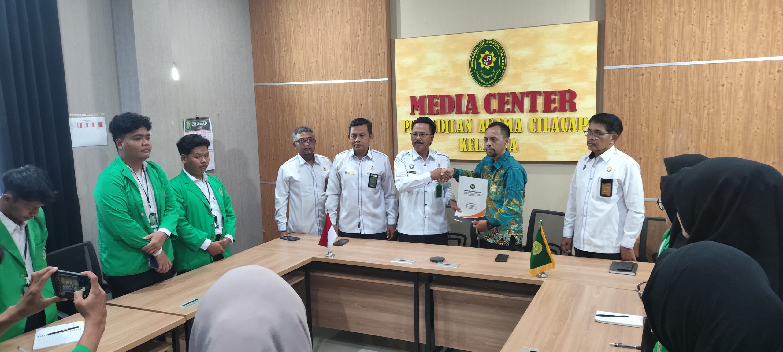 Cilacap – Senin, 13 Januari 2022, Bertempat di ruang Media Center Pengadilan Agama Cilacap,Ketua Pengadilan Agama Cilacap Drs. Ahmad Juaeni, M.H. bersama dengan Wakil Ketua Azimar Rusydi, S.Ag., MH., Panitera Mokhamad Miftah, S.Ag, M.H. dan Sekretaris Wardoyo Dwi Astoto, SE., MSi., menerima kedatangan mahasiswa Praktek Pengalaman Lapangan (PPL) dari Fakultas Syariah UIN Profesor Kiai Haji Saifuddin Zuhri Purwokerto.