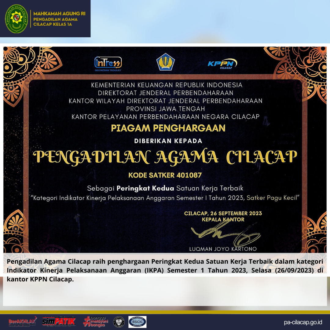 Cilacap, PA Cilacap – Pengadilan Agama Cilacap raih penghargaan Peringkat Kedua Satuan Kerja Terbaik dalam kategori Indikator Kinerja Pelaksanaan Anggaran (IKPA) Semester 1 Tahun 2023, Selasa (26/09/2023) di kantor KPPN Cilacap.