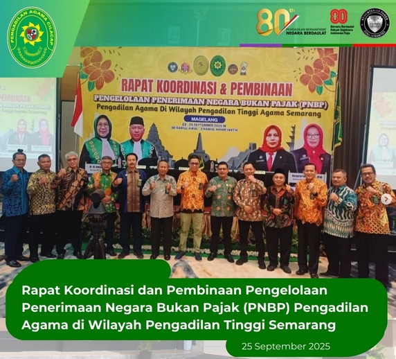 Cilacap, 26 September 2025 – Pengadilan Agama Cilacap menghadiri kegiatan pembinaan yang diselenggarakan oleh Pengadilan Tinggi Agama Semarang, bertempat di Hotel Atria Magelang (24/9). Acara ini diikuti oleh Ketua, Panitera, dan Sekretaris dari seluruh Pengadilan Agama se-Jawa Tengah sebagai wujud komitmen bersama untuk meningkatkan kualitas layanan peradilan agama. PA Cilacap turut serta dalam Rapat Koordinasi & Pembinaan Pengelolaan Penerimaan Negara Bukan Pajak (PNBP), yang menjadi agenda penting dalam memastikan tata kelola keuangan peradilan berjalan transparan, akuntabel, dan sesuai aturan yang berlaku.