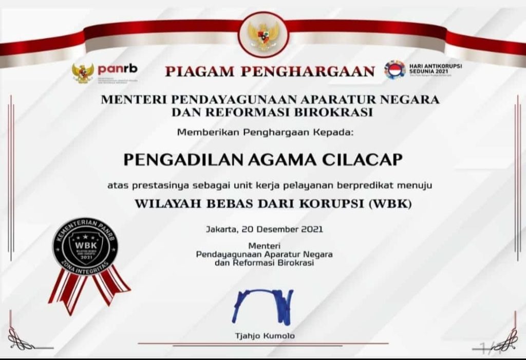Surat Direktur Jenderal Badan Peradilan Agama Nomor : 4421/HM.00/12/2021, tanggal 28 Desember2021, perihal “Penghargaan Satuan Kerja Berpedrikat WBK/WBBM di Lingkungan Peradilan Agama Tahun 2021”.