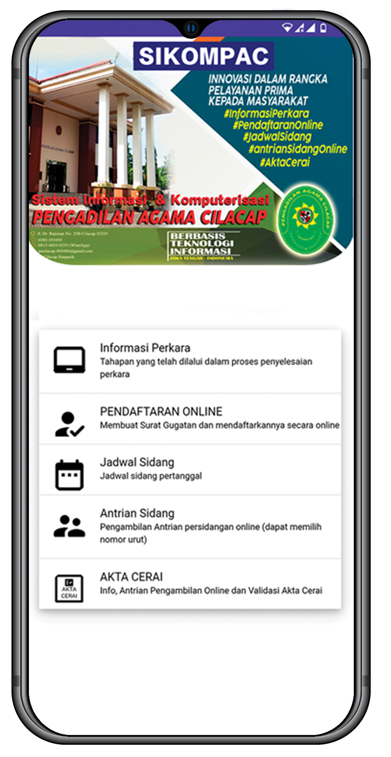 Kebutuhan mendapatkan infromasi dari pengadilan secara mudah, murah dan cepat adalah merupakan keniscayaan di era teknologi informaasi ini. Menyadari hal tersebut Pengadilan Agama Cilacap terus berupaya untuk meberikan pelayanan yang terbaik dan memuaskan bagi masyarakat dengan menerapkan berbagai aplikasi sebagaimana telah dibuat oleh Mahkamah Agung maupun Dirjen Badilag juga membuat inovasi sendiri.