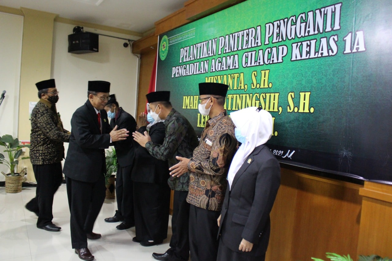 Acara dimulai dengan menyanyikan lagu Indonesia Raya dan Hymne Mahkamah Agung RI, kemudian dilanjutkan dengan acara pelantikan Bapak Misyanta, S.H, Ibu Imah Supriyatiningsih, S.H, Leni Vianita, S.H, sebagai Panitera Pengganti Pengadilan Agama Cilacap