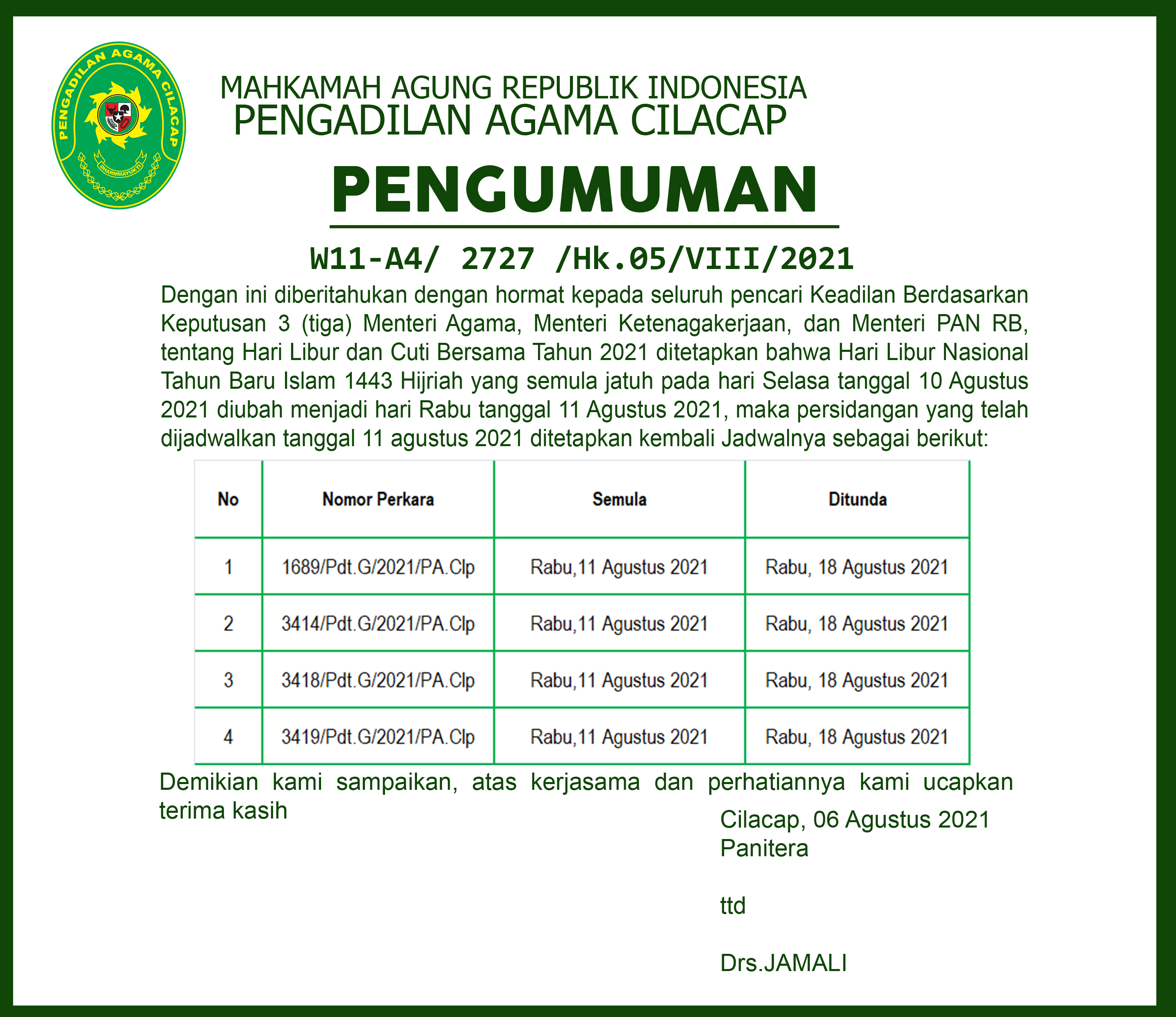 E-mail Cetak Pengumuman Perubahan Jadwal Sidang on 05 Agustus 2021. on 05 Agustus 2021. Dilihat: 1318