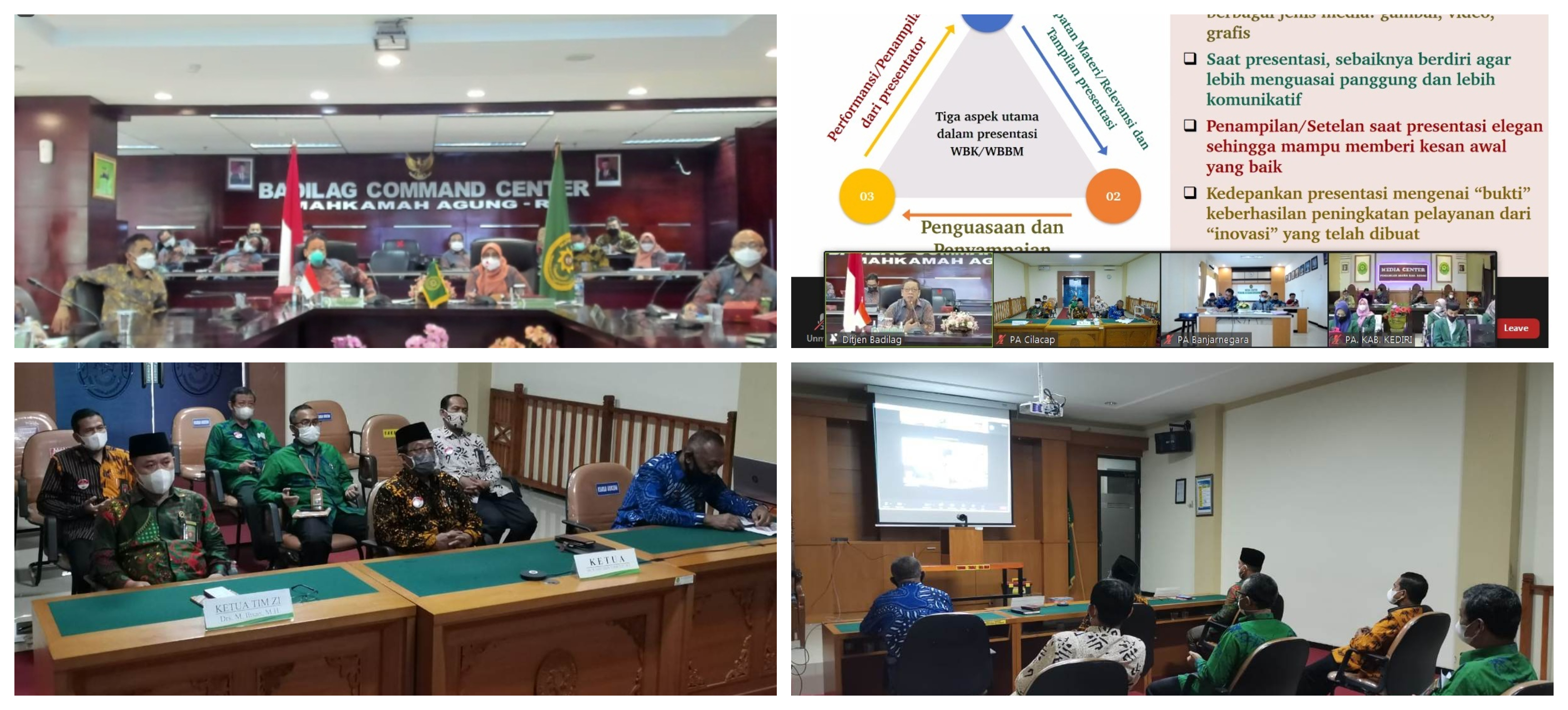 Jumat, 06 Agustus 2021 di ruang Media Center Pengadilan Agama Cilacap, melaksanakan Zoom Meeting Persiapan Penilaian Pembangunan ZI Menuju WBK dan WBBK dengan Direktorat Jendral Badan Peradilan Agama Oleh Bapak Direktur Jenderal “Dr. Drs. Aco Nur, S.H., M.H., ” yang di ikuti oleh 46 (empat puluh enam) yang di usulkan ke WBBK dan 128 yang di usulkan untuk evaluasi WBK, untuk Pengadilan Agama Cilacap Termasuk yang di usulkan untuk Evaluasi WBK. Dari Pengadilan Agama Cilacap yang mengikuti pendampingan tersebut di hadiri oleh Ketua “Drs. H. Saefuddin Turmudzy, M.H.”, Wakil Ketua selaku Ketua Tim ZI “Drs. M. Ihsan, M.H.”, dan 6 (enam) Ketua Koordinator Area dan anggotanya. Pesan dari bapak Dr. Drs. Aco Nur, S.H., M.H. untuk yang mengikuti acara tersebut “WBK/WBBK bukan sekadar predikat, keduanya membawa tanggung jawab moril yang besar pada institusi. Sekali lagi, ini bukan tentang kebanggaan mengenai predikat, melainkan dedikasi tanpa batas dan keinsyafan kita dalam melayani kepentingan para pencari keadilan dengan sebaik-baiknya pelayanan”