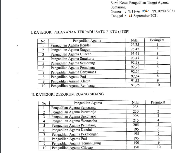 Cilacap, 14 September 2021 Pengadilan Agama Cilacap menerima penghargaan sebagai Peringkat III Pelayanan Terpadu Satu Pintu (PTSP) dan Masuk 10 besar Kategori Dekorum Ruang Sidang tingkat Pengadilan Tinggi Agama Semarang Tahun 2021.