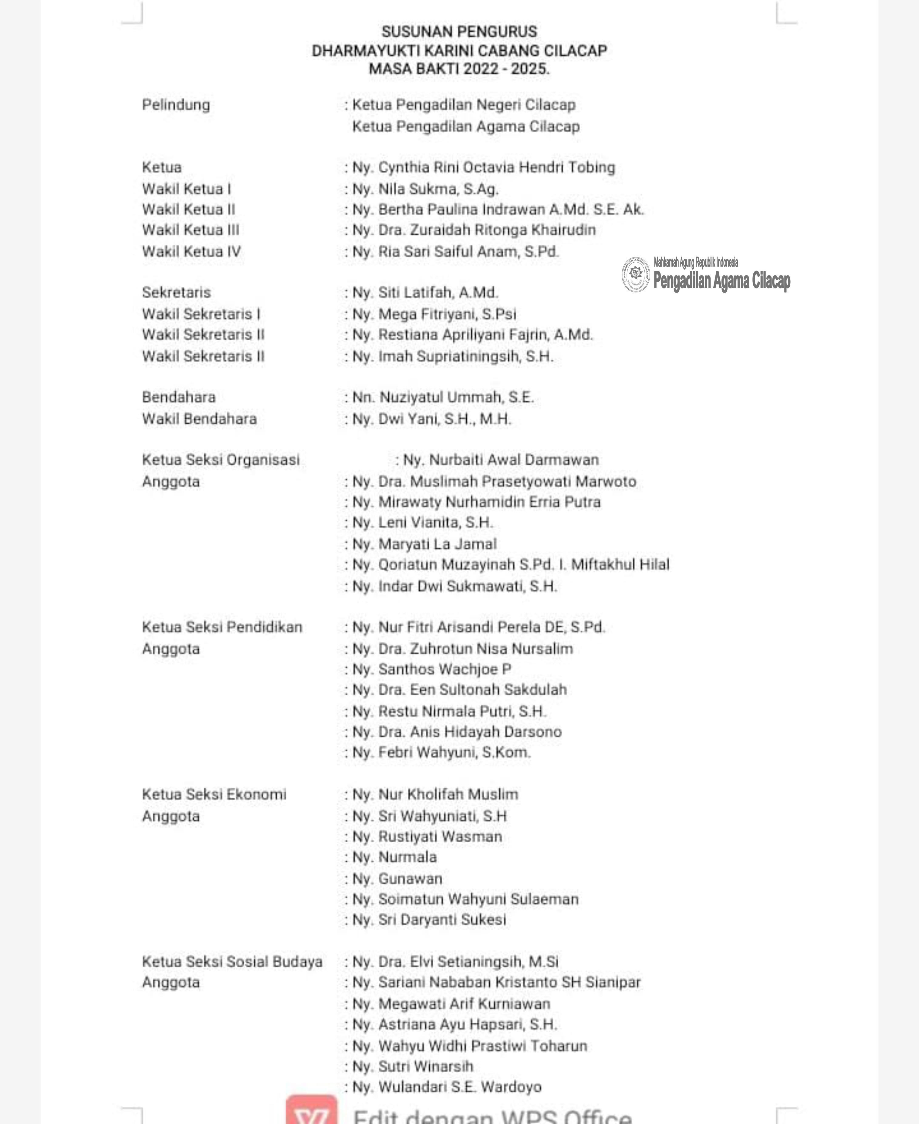 Dua hari sebelumnya (Rabu, 18 Mei 2022) bertempat di pendopo kabupaten cilacap, telah dilantik pengurus cabang dharmayukti karini cilacap dengan susunan pengurus sebagai berikut: