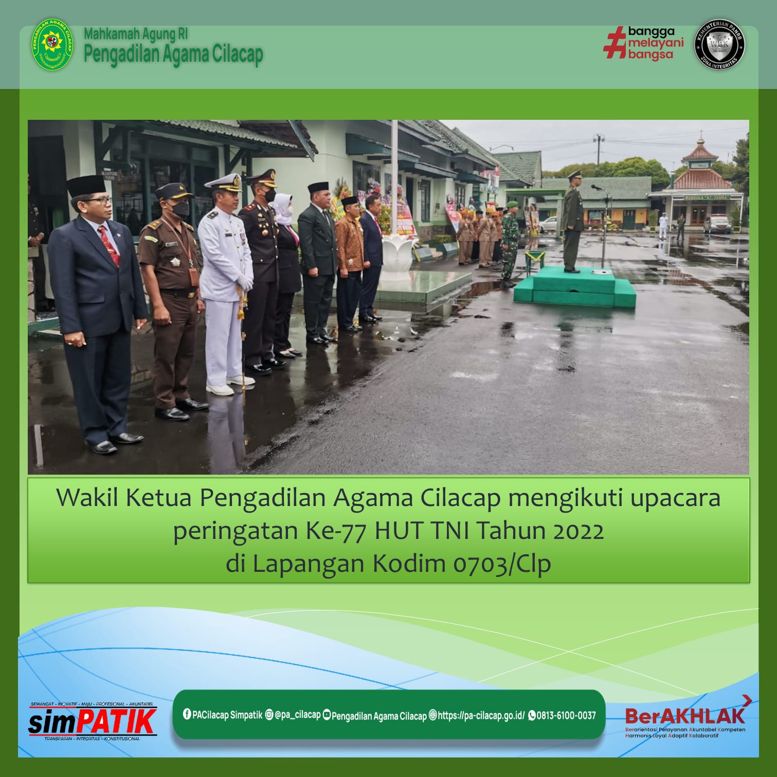 Cilacap, PA Cilacap – Wakil Ketua Pengadilan Agama Cilacap mengikuti upacara peringatan HUT Ke-77 TNI di lapangan Kodim 0703/Clp (5/10/2022).