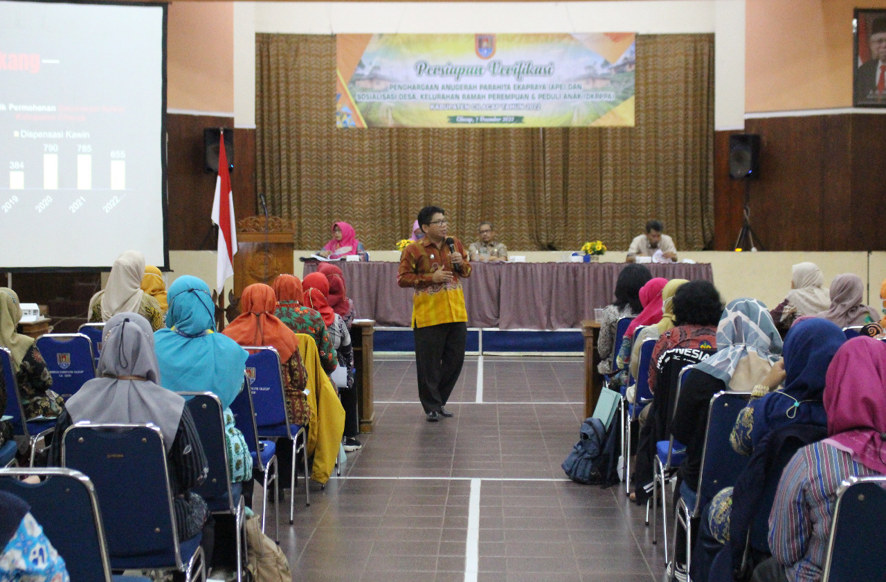 Cilacap, PA Cilacap, Mengawali bulan pertama di akhir tahun ini, Kamis 1 Desember 2022, Wakil Ketua Pengadilan Agama Cilacap Yang Mulia Bapak Akhmad Kholil Irfan S.A.g, S.H., M.H. melaksanakan tugas sebagai narasumber dalam acara sosialisasi percepatan dan pembentukan Kelurahan/Desa Ramah Perempuan dan Peduli Anak (K/DRPPA) yang diselenggarakan oleh Pemerintah Kabupaten Cilacap melalui Dinas Keluarga Berencana, Pemberdayaan Perempuan dan Perlindungan Anak (Dinas KB, PP dan PA) di Aula Diklat Praja Kabupaten Cilacap.