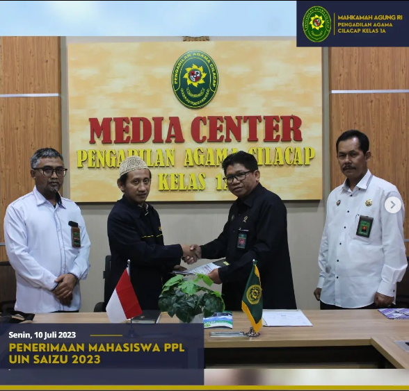 Senin, 10 Juli 2023 Wakil Ketua Pengadilan Agama Cilacap, Akhmad Kholil Irfan, S.Ag., S.H. M.H. didampingi Panitera dan Sekretaris Pengadilan Agama Cilacap menerima serah terima mahasiswa praktik pengalaman lapangan Universitas Islam Negeri Profesor Haji Saifuddin Zuhri Purwokerto.