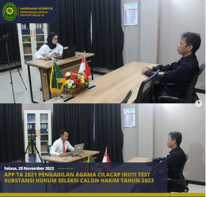 Cilacap, Selasa 28/11/2023 - Analis Perkara Peradilan (APP) Pengadilan agama Cilacap TA2021 mengikuti Test Substansi Hukum dalam Seleksi Calon Hakim Tahun 2023. Alfan Alfian, S.H. mengikuti test pada sesi V dan Mulia Sixtrianti, S.H. di sesi VI. Keduanya mengikuti test dengan tertib dan test berjalan dengan baik tanpa terkendala apa pun.