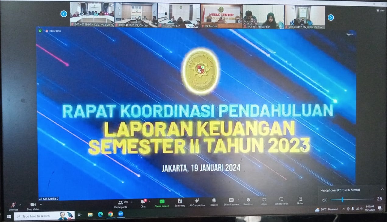 Cilacap - Pengadilan Agama Cilacap mengikuti kegiatan rapat pendahuluan persiapan penyusunan laporan keuangan Mahkamah Agung tahun 2023 secara virtual melalui aplikasi Zoom Meeting secara daring, Jumat (19/1/2024). Kegiatan ini bertujuan untuk menyamakan persepsi dan mempersiapkan data-data yang diperlukan dalam penyusunan laporan keuangan Mahkamah Agung yang akan diperiksa oleh Badan Pemeriksa Keuangan (BPK) guna memperoleh opini Wajar Tanpa Pengecualian (WTP).