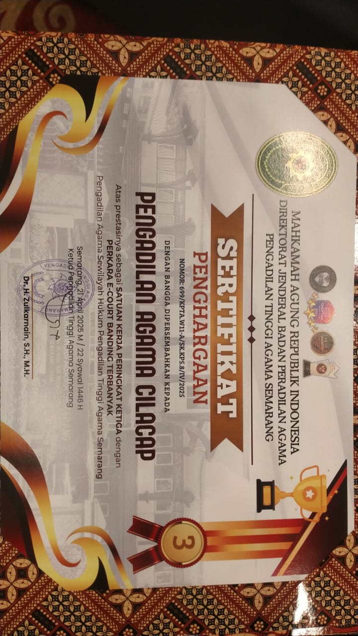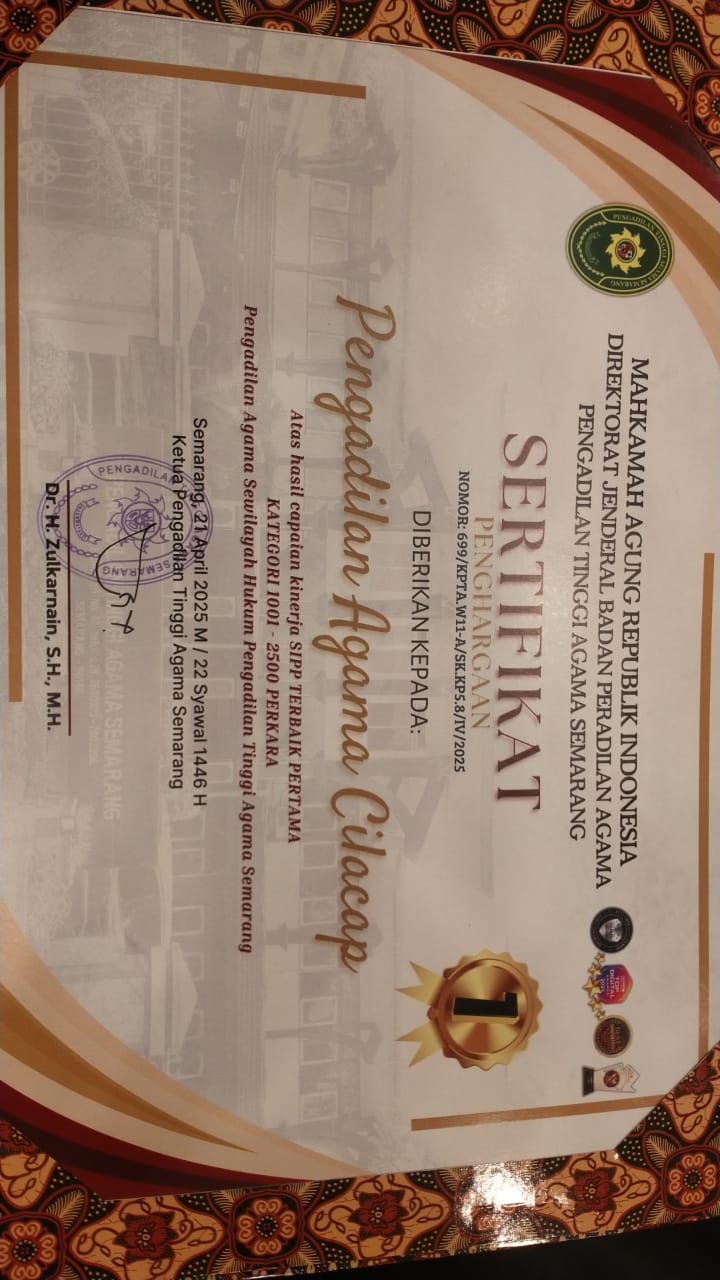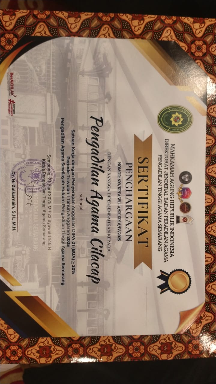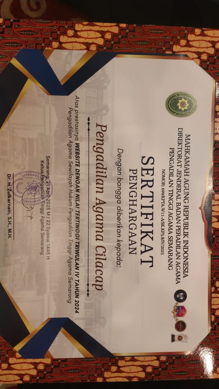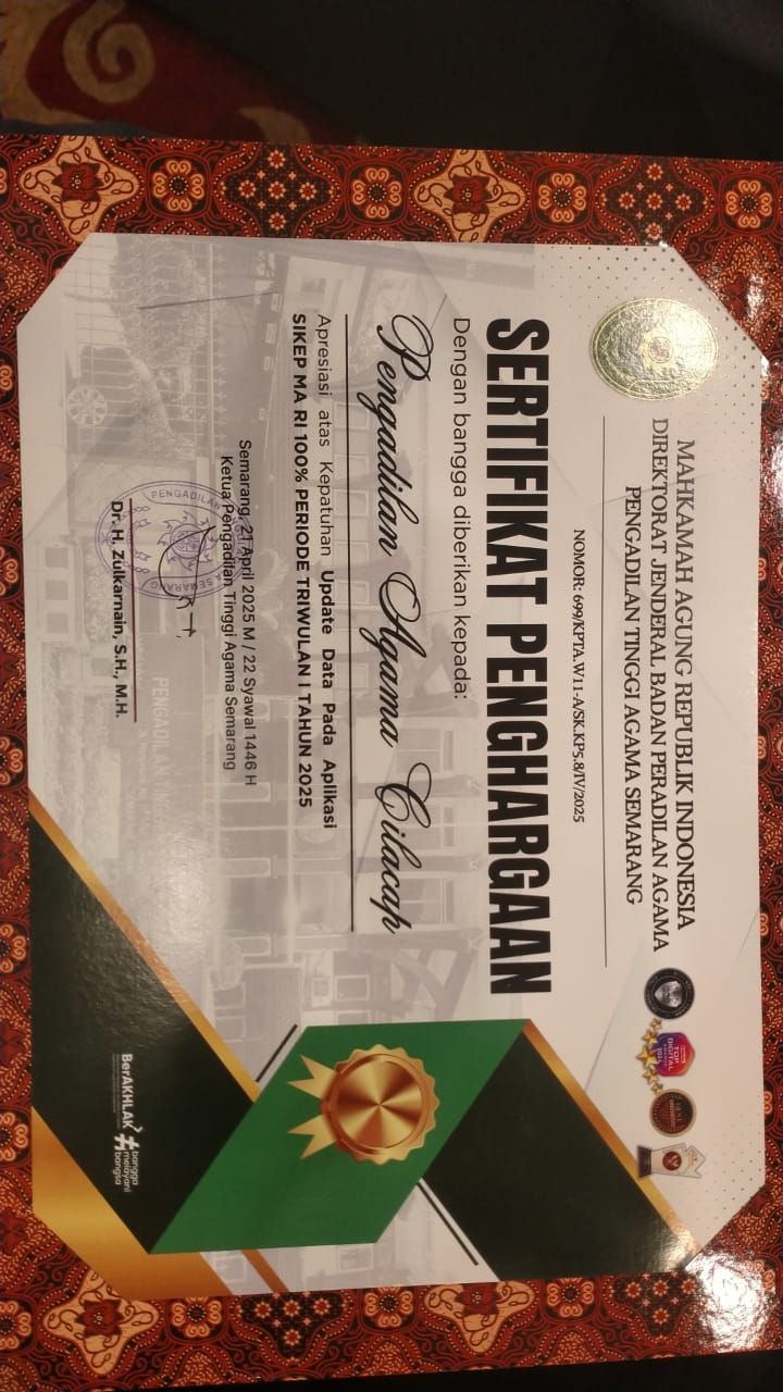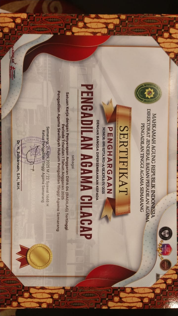 Cilacap, 22/04/2025 - Pengadilan Agama (PA) Cilacap kembali menorehkan prestasi gemilang pada ajang PTA Semarang Awards Triwulan I Tahun 2025 yang bertempat di The Sunan Hotel Solo pada 21 April 2025