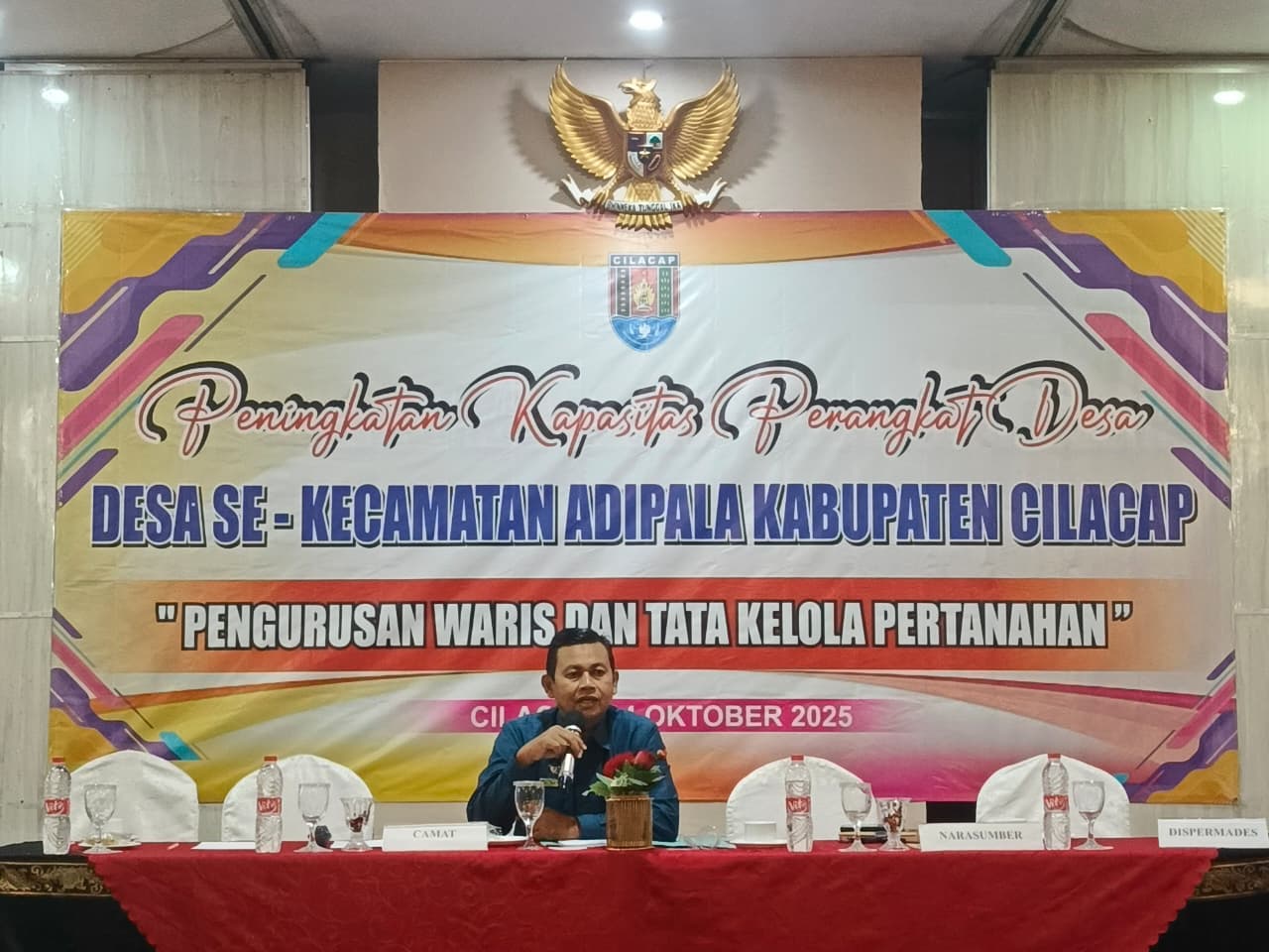 Cilacap, 14/10/2025 - Waka PA. Cilacap Azimar Rusydi S.Ag., MH., menjadi Narasumber pada acara Peningkatan Kapasitas Perangkat Desa se-Kecamatan Adipala yang akan dilaksanakan pada hari Selasa 14 Oktober 2025 di Hotel Sindoro Jl. Jend. Sudirman No.1 Sidakaya Cilacap. Tema yang disampaikan tentang Pengurusan Waris dan Tata Kelola Pertanahan.