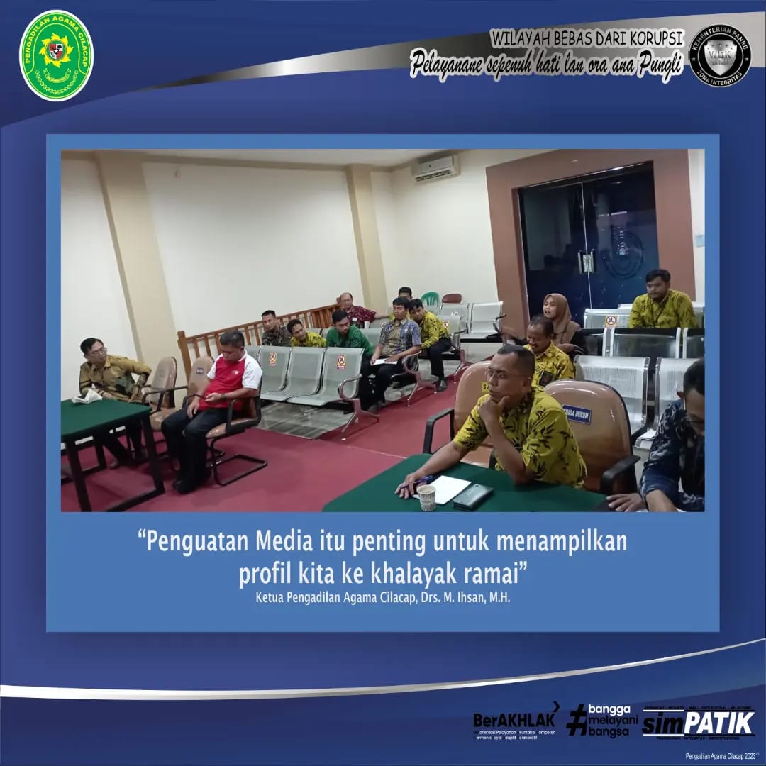 Selanjutnya, dalam rapat ini juga membahas tentang penguatan peran media sosial sebagai teras digital kita. Disampaikan oleh Ketua Pengadilan Agama Cilacap, Drs. M. Ihsan, M.H. dalam sambutan beliau bahwa media sosial berperan penting dalam pembangunan Zona Integritas menuju WBBM yang akan kita jalani.