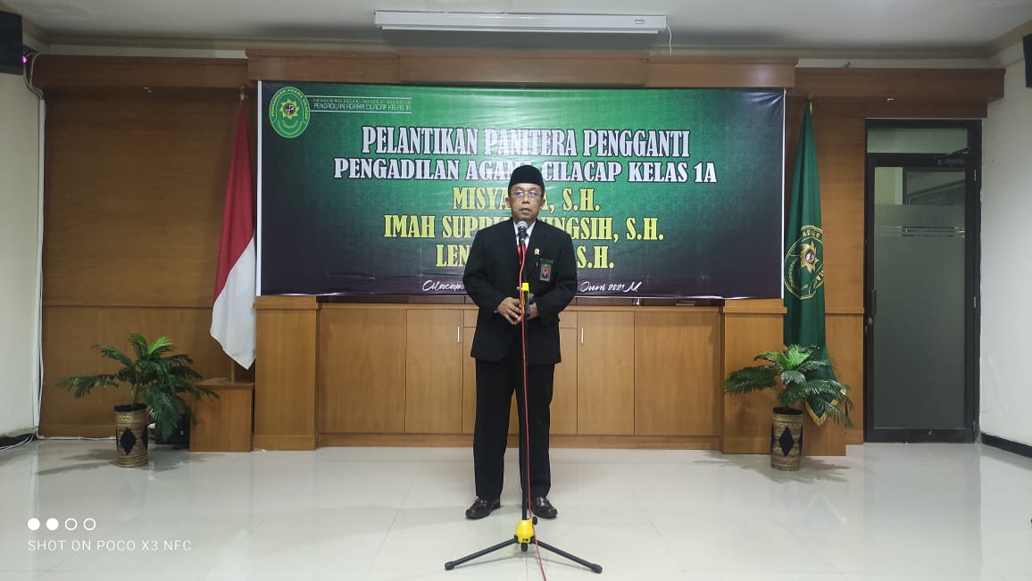 Acara dimulai dengan menyanyikan lagu Indonesia Raya dan Hymne Mahkamah Agung RI, kemudian dilanjutkan dengan acara pelantikan Bapak Misyanta, S.H, Ibu Imah Supriyatiningsih, S.H, Leni Vianita, S.H, sebagai Panitera Pengganti Pengadilan Agama Cilacap