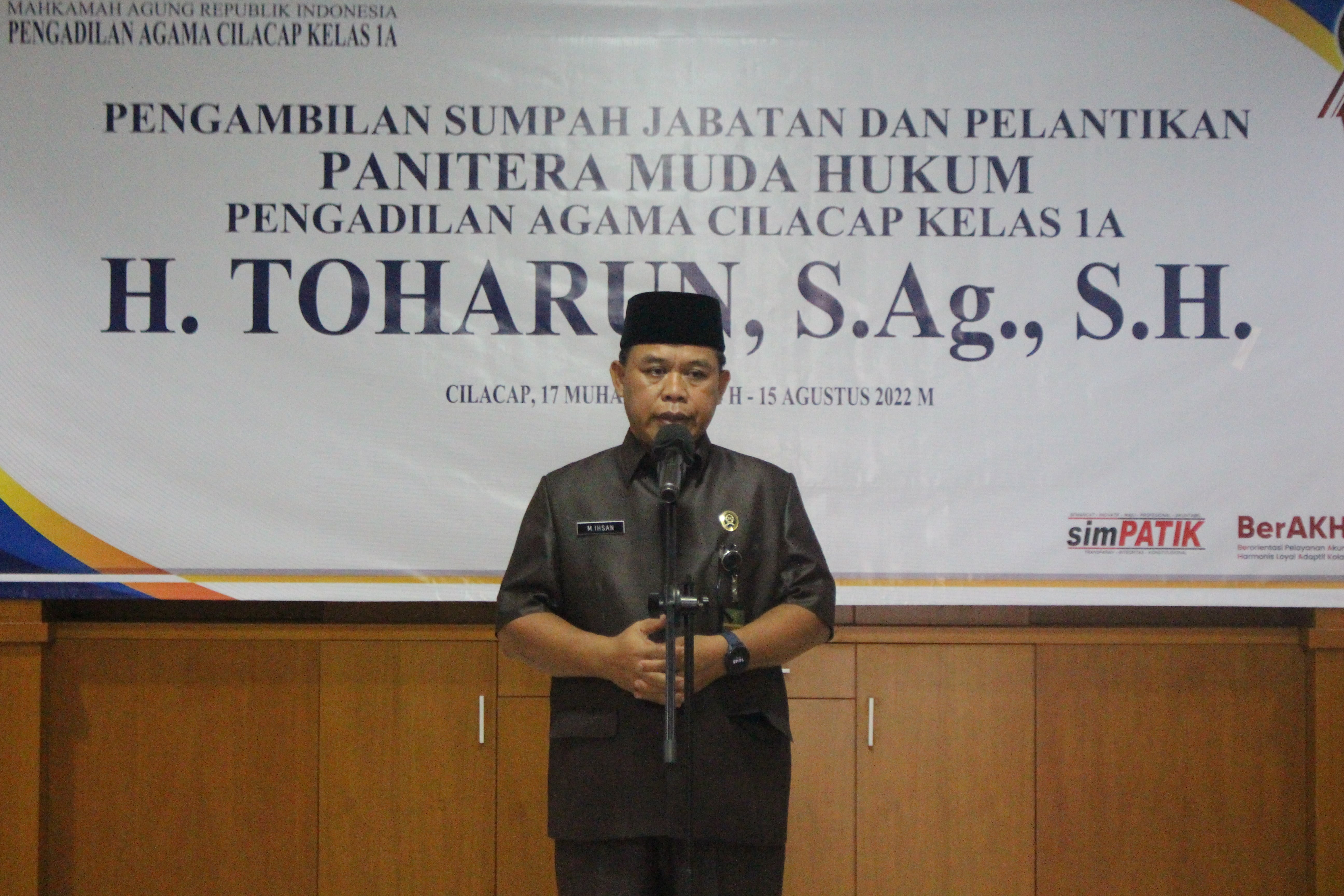 Cilacap, 15 Agustus 2022 pukul 14.00 WIB bertempat di Ruang Sidang Utama Pengadilan Agama Cilacap, dilaksanakan acara Pelantikan dan Pengambilan Sumpah Jabatan Atas Nama H. Toharun, S.Ag., S.H., sebagai Panitera Muda Hukum. Bertindak sebagai Pejabat Yang Mengambil Sumpah Drs. M. Ihsan, M.H., selaku Ketua Pengadilan Agama Cilacap.