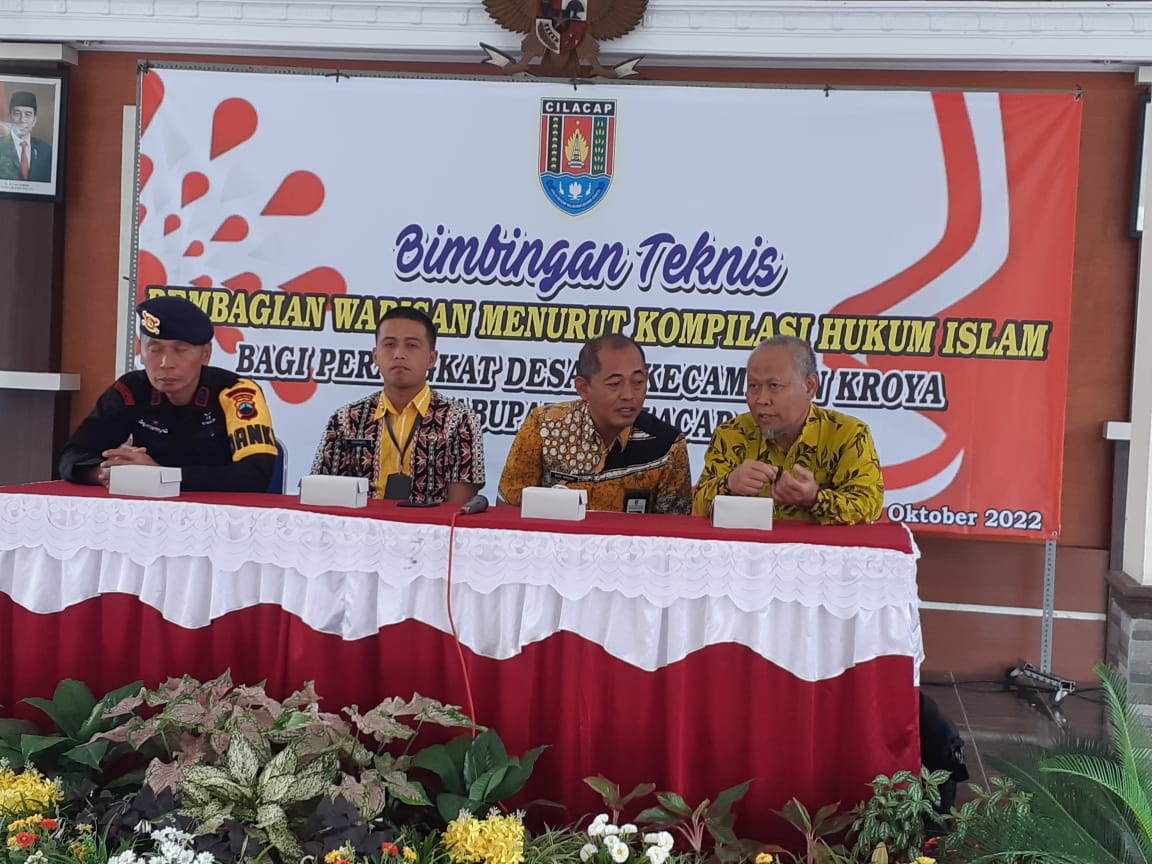 Kroya, 06 Oktober 2022 Ketua Pengadilan Agama Cilacap yang sebelumnya mendapat surat dari Kepala Kecamatan Kroya sebagai Narasumber dalam acara Bimbingan Teknis Pembagian Warisan Menurut Kompilkasi Hukum Islam. Ketua Pengadilan menugaskan Hakim Pengadilan Agama Cilacap yang bernama Drs. H. Nur Amin, M.H. sebagai Narasumber. Bimbingan Teknis tersebut dihadiri oleh Sekretaris Desa, Kepala Seksi Pemerintahan/ Pelayanan , Kepala Dusun, dan Staf se Kecamatan Kroya.