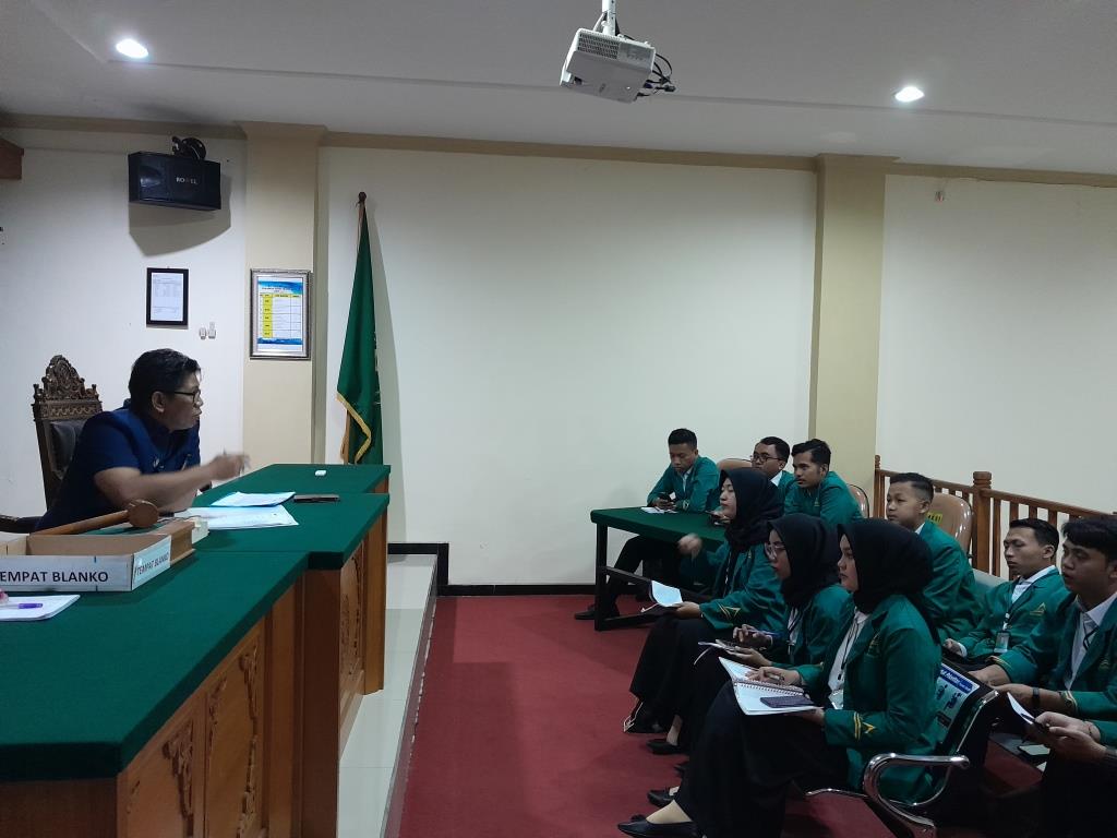 Kegiatan pembekalan materi tersebut dimulai dari pukul 08.00 s/d 09.00 WIB dimana materi yang disampaikan meliputi tentang pengertian hukum Formil dan Materiil, Kompetensi Pengadilan Agama, serta pengertian Gugatan dan Permohonan. Kegiatan pembekalan tersebut disampaikan secara interaktif, yang mana pemateri memberikan pemaparan sedangkan mahasiswa memberikan Feedback baik tanggapan atau pertanyaan. Hal ini dilakukan guna untuk meningkatkan kemampuan mahasiswa dalam pengusaaan hukum acara yang digunakan dalam Pengadilan Agama.