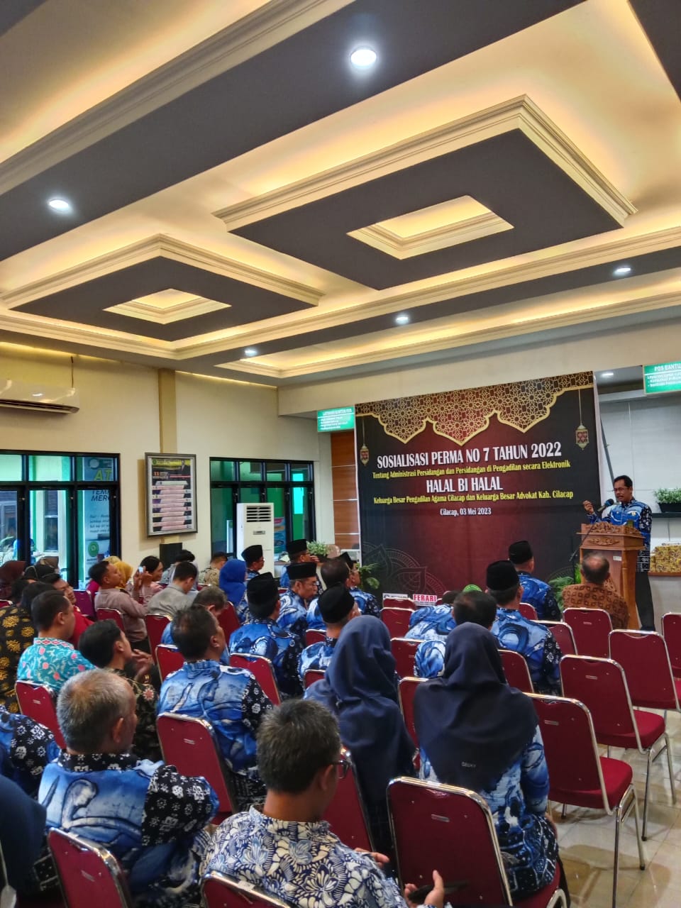 Sosialiasi yang dibalut dengan acara halal bi halal ini selain sebagai wahana edukasi dan transfer ilmu, juga sebagai ajang silaturrahmi. Pasalnya selain masih dalam moment lebaran, bahwa keluarnya Perma tersebut menuntut seluruh yang masuk dalam bisnis proses berperkara di Pengadilan Agama Cilacap termasuk pengacara harus benar-benar dapat menerapkan peraturan tersebut sebagai bagian dari penegakan keadilan bagi para pencari keadilan di lingkuangan Pengadilan Agama Cilacap, sehingga perlu adanya penyamaan persepsi berupa sosialisasi terkait pelaksanaan administrasi berperkara dan persidangan secara elektronik ini.