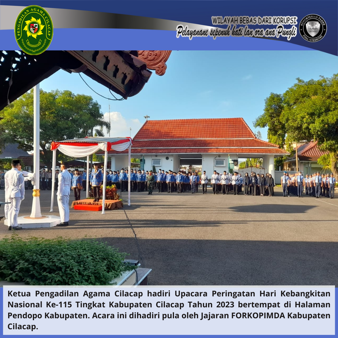 Ketua Pengadilan Agama Cilacap hadiri Upacara Peringatan Hari Kebangkitan Nasional Ke-115 Tingkat Kabupaten Cilacap Tahun 2023 bertempat di Halaman Pendopo Kabupaten. Acara ini dihadiri pula oleh Jajaran FORKOPIMDA Kabupaten Cilacap.