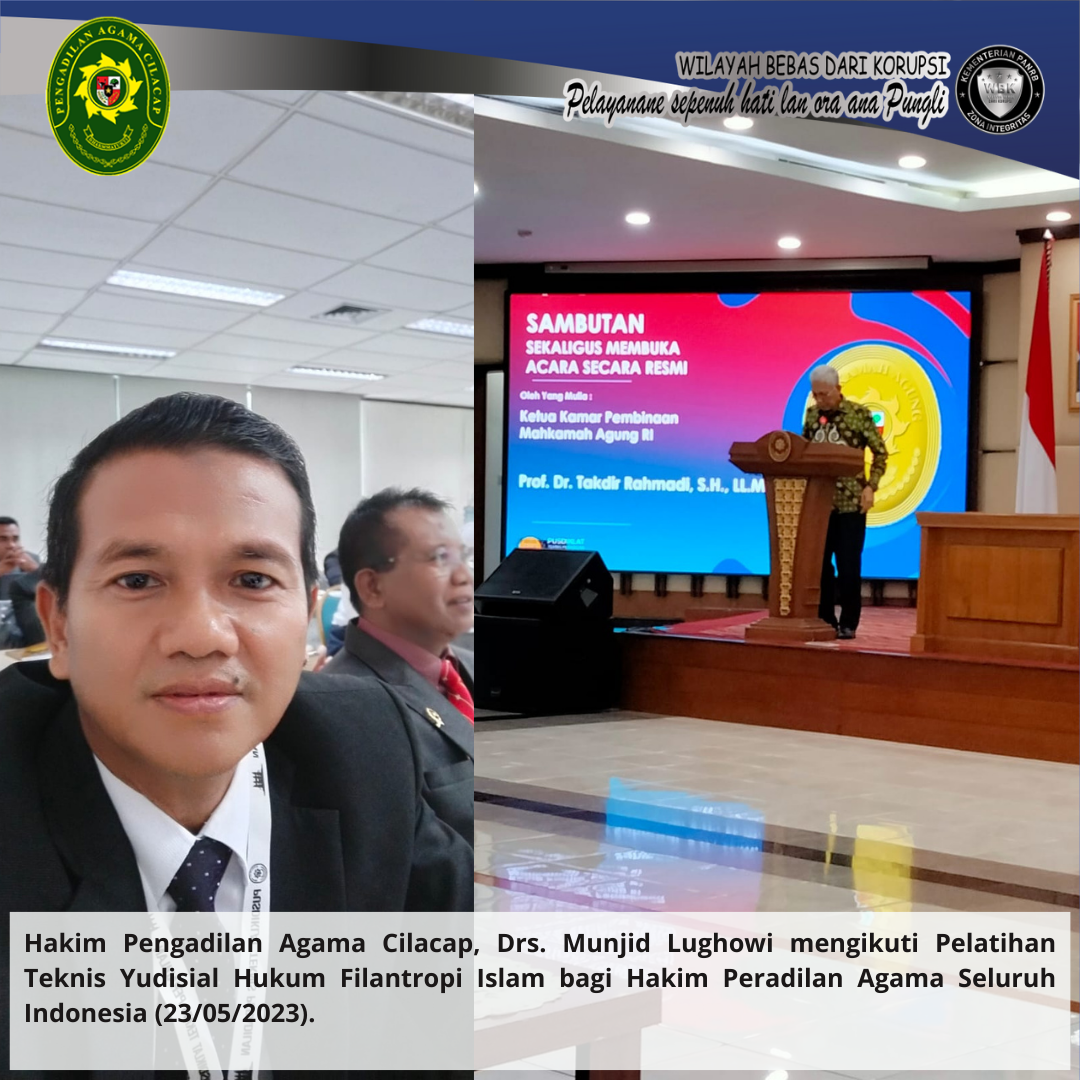Hakim Pengadilan Agama Cilacap, Drs. Munjid Lughowi mengikuti Pelatihan Teknis Yudisial Hukum Filantropi Islam bagi Hakim Peradilan Agama Seluruh Indonesia (23/05/2023).
