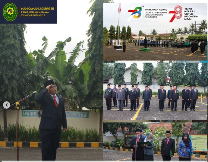 Kamis, 17 Agustus 2023 – Bertempat di halaman kantor Pengadilan Agama Cilacap tepat pada pukul 07.00 dilaksanakan upacara peringatan HUT Kemerdekaan Republik Indonesia yang ke-78 Tahun. Upacara yang dilaksanakan dengan lancar dan penuh khidmat ini diikuti oleh seluruh Hakim, Pegawai Pengadilan Agama Cilacap.dan mahasiswa PPL