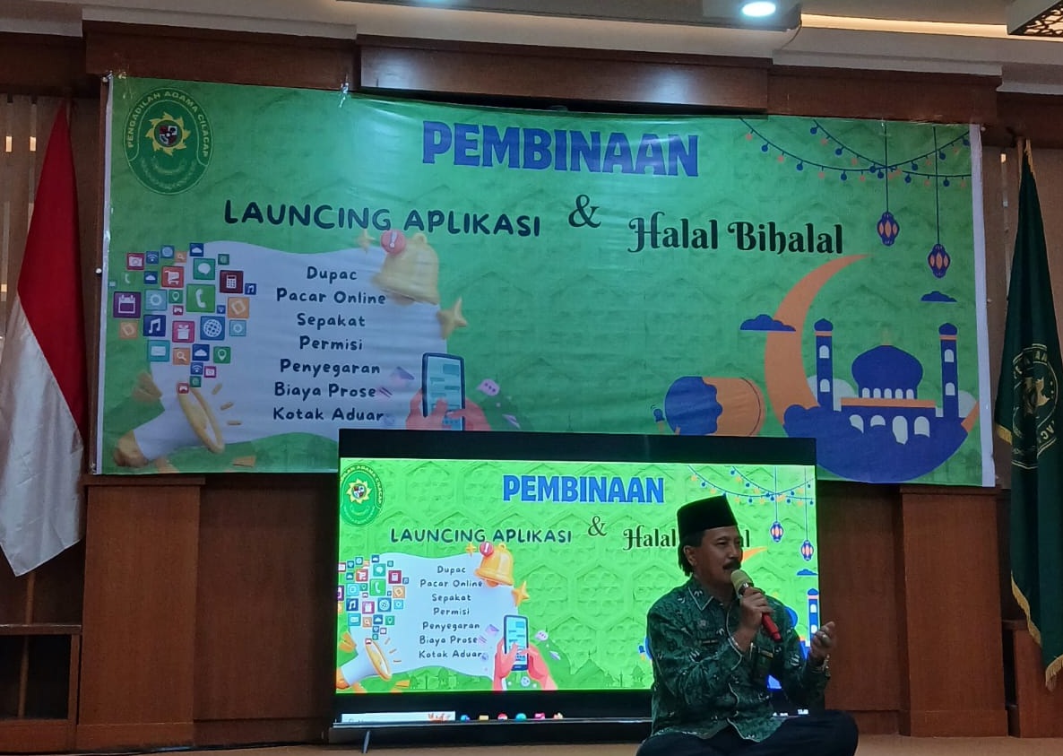 Cilacap - bertempat di ruang Ruang Sidang Utama Pengadilan Agama Cilacap dilaksanakan kegiatan Gelar Pembinaan, Launching Inovasi & Halal Bihalal pada hari Kamis (10/04/25) pukul 13.00 WIB, yang dihadiri oleh Ketua, Wakil Ketua, Hakim, Panitera, Sekretaris, Pejabat Struktural maupun Fungsional serta karyawan dan karyawati Pengadilan Agama Cilacap. Acara dimulai dengan Pembacaan do’a oleh Sudin, S.Ag., MH, kemudian Pembinaan oleh Ketua Pengadilan Agama Cilacap Ahmad Juaeni, S.Ag, MH. Dalam pembinaannya beliau menekankan bahwa saling memaafkan itu harus dengan hati bukan hanya cukup dengan ucapan. Dalam acara ini beliau juga melakukan pelaunchingan inovasi PA Cilacap yang bernama PERMADANI. Dalam proses peluncuran inovasi ini beliau didampingi oleh Wakil Ketua, Panitera dan Sekretaris PA Cilacap. Permadani merupakan Singkatan dari beberapa aplikasi yang terdiri dari aplikasi Dupac, Pacar Online, Sepakat, Permisi, Penyegaran, Biaya Prose dan Kotak Aduan.